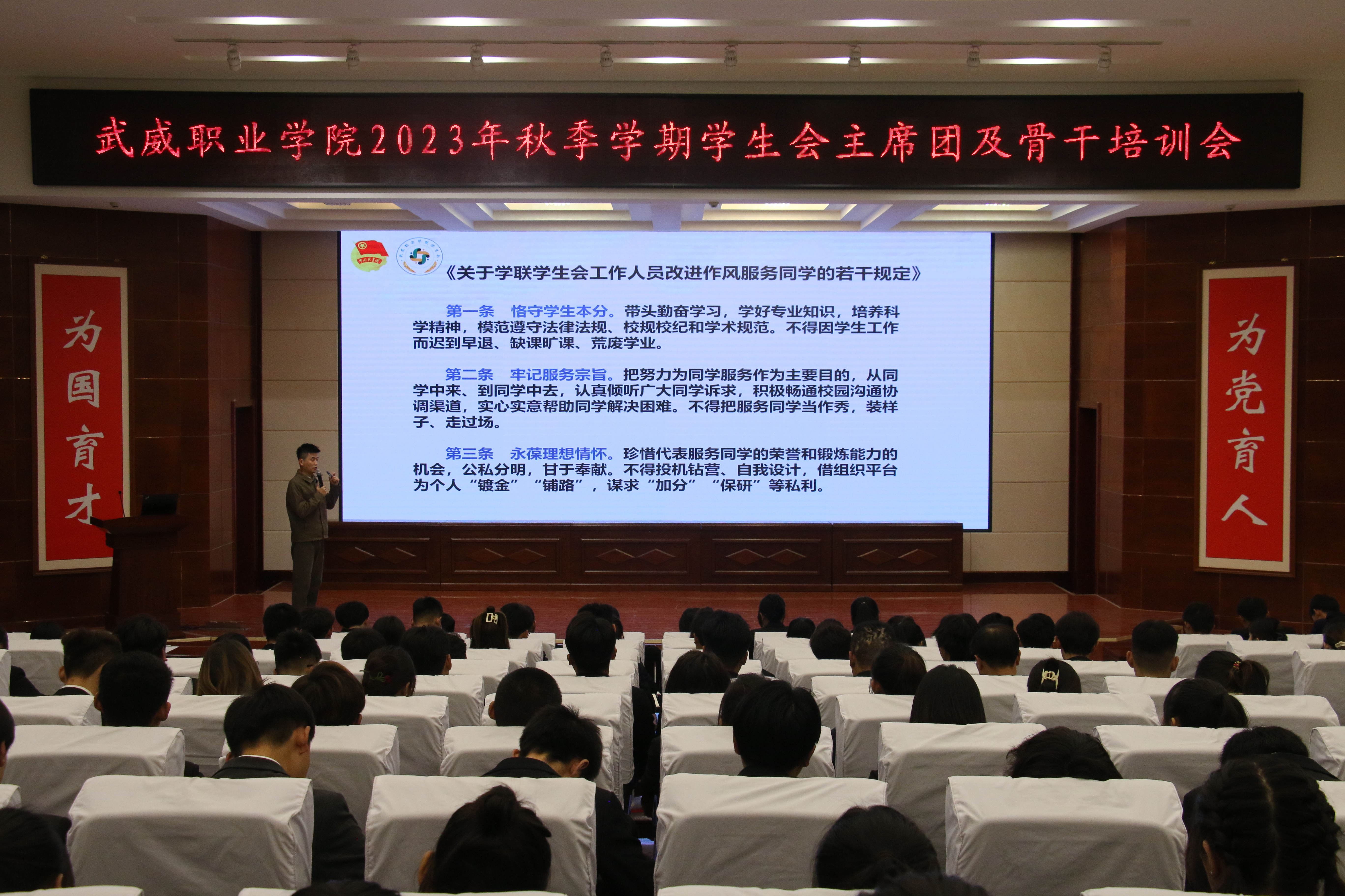 校學(xué)生會(huì)主席團(tuán)成員帶頭領(lǐng)學(xué)了《關(guān)于學(xué)聯(lián)學(xué)生會(huì)工作人員改進(jìn)作風(fēng)服務(wù)同學(xué)的若干規(guī)定》《武威職業(yè)學(xué)院學(xué)生會(huì)章程》等制度文件。學(xué)生會(huì)秘書長(zhǎng)張登海以《微光凝聚星海,筑夢(mèng)情懷方舟》為題,圍繞加強(qiáng)思想政治建設(shè)、深化學(xué)生會(huì)組織改革和進(jìn)一步加強(qiáng)從嚴(yán)治會(huì)等方面,為學(xué)生會(huì)組織成員展開培訓(xùn)。