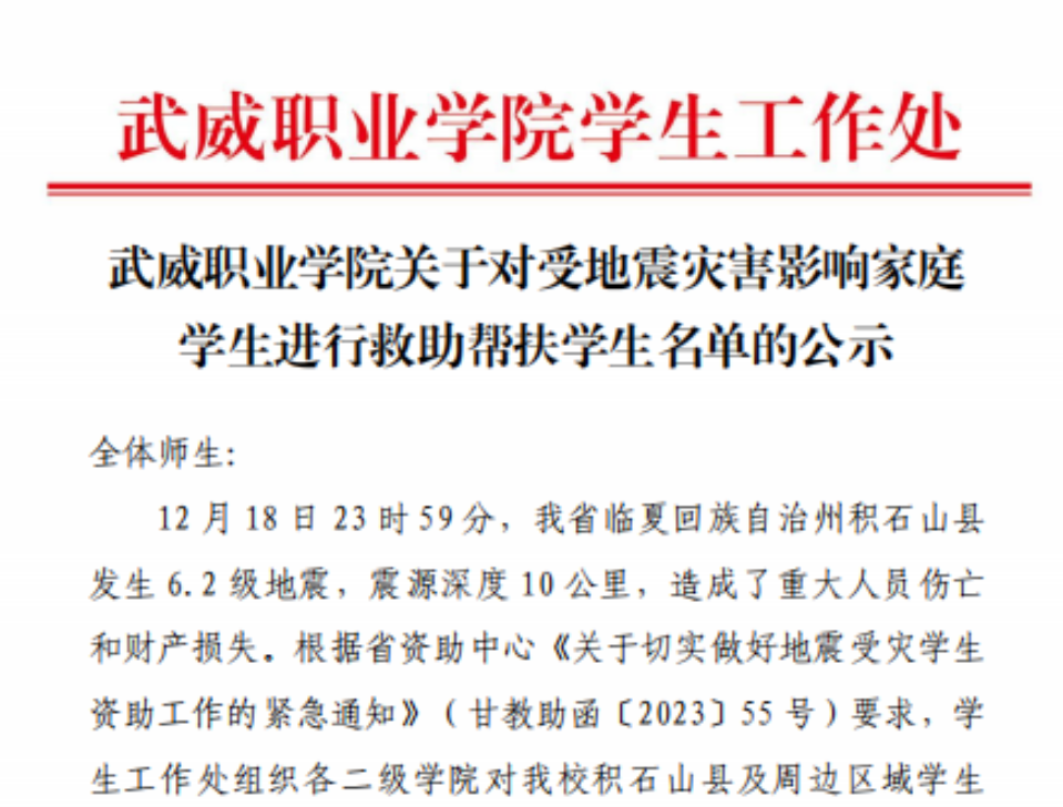 12月18日23時59分,我省臨夏回族自治州積石山縣發(fā)生6.2級地震。地震發(fā)生后,學(xué)校高度重視災(zāi)區(qū)學(xué)生家庭受災(zāi)情況,密切關(guān)注各項災(zāi)情的發(fā)展變化,第一時間對積石山縣及周邊區(qū)域地震受災(zāi)家庭學(xué)生情況進行摸排,迅速啟動救助幫扶關(guān)愛工作。