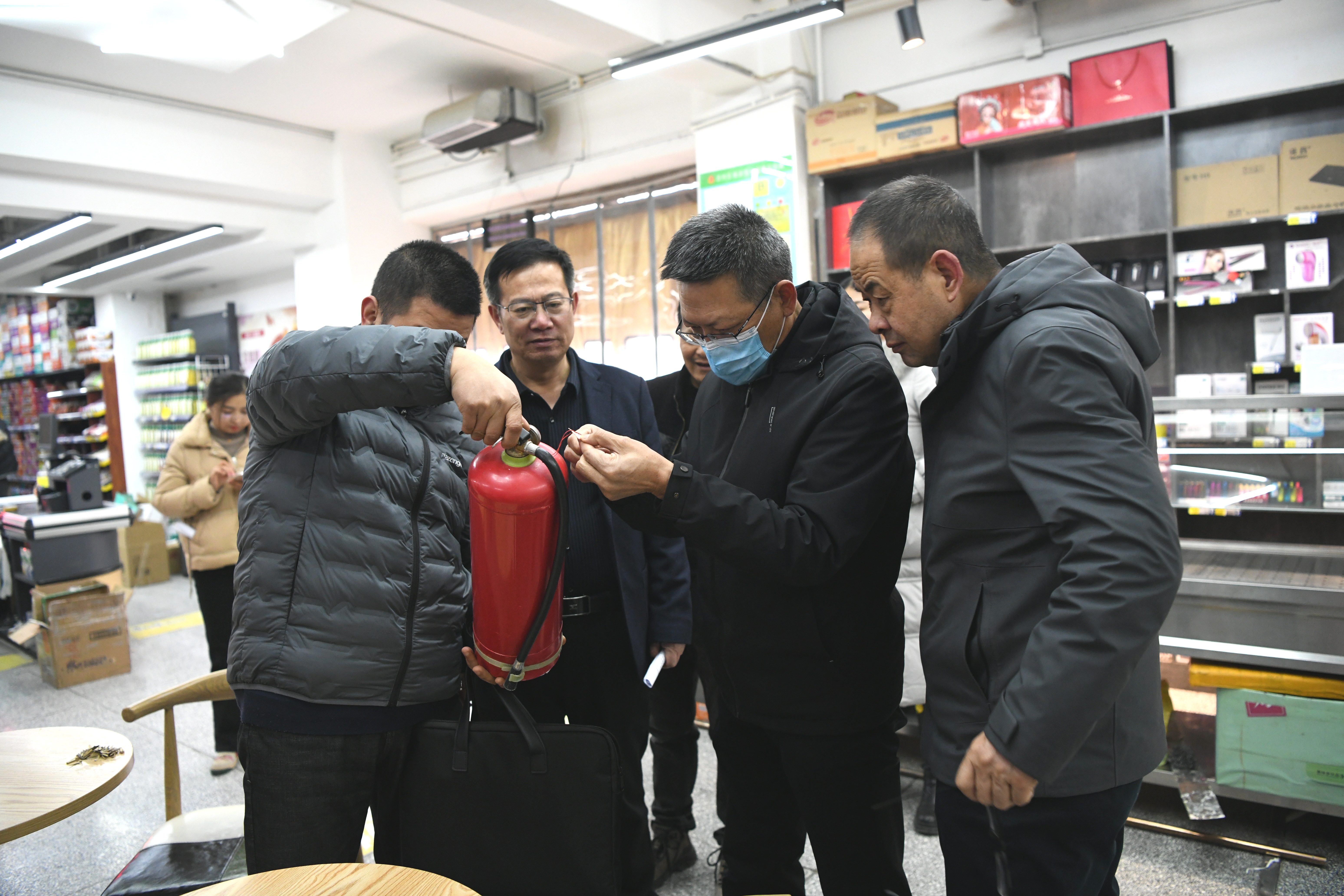 在實驗實訓(xùn)室內(nèi),督察組詢問設(shè)施設(shè)備準(zhǔn)備情況,逐一檢查實訓(xùn)場地內(nèi)消防安全設(shè)施配備情況。