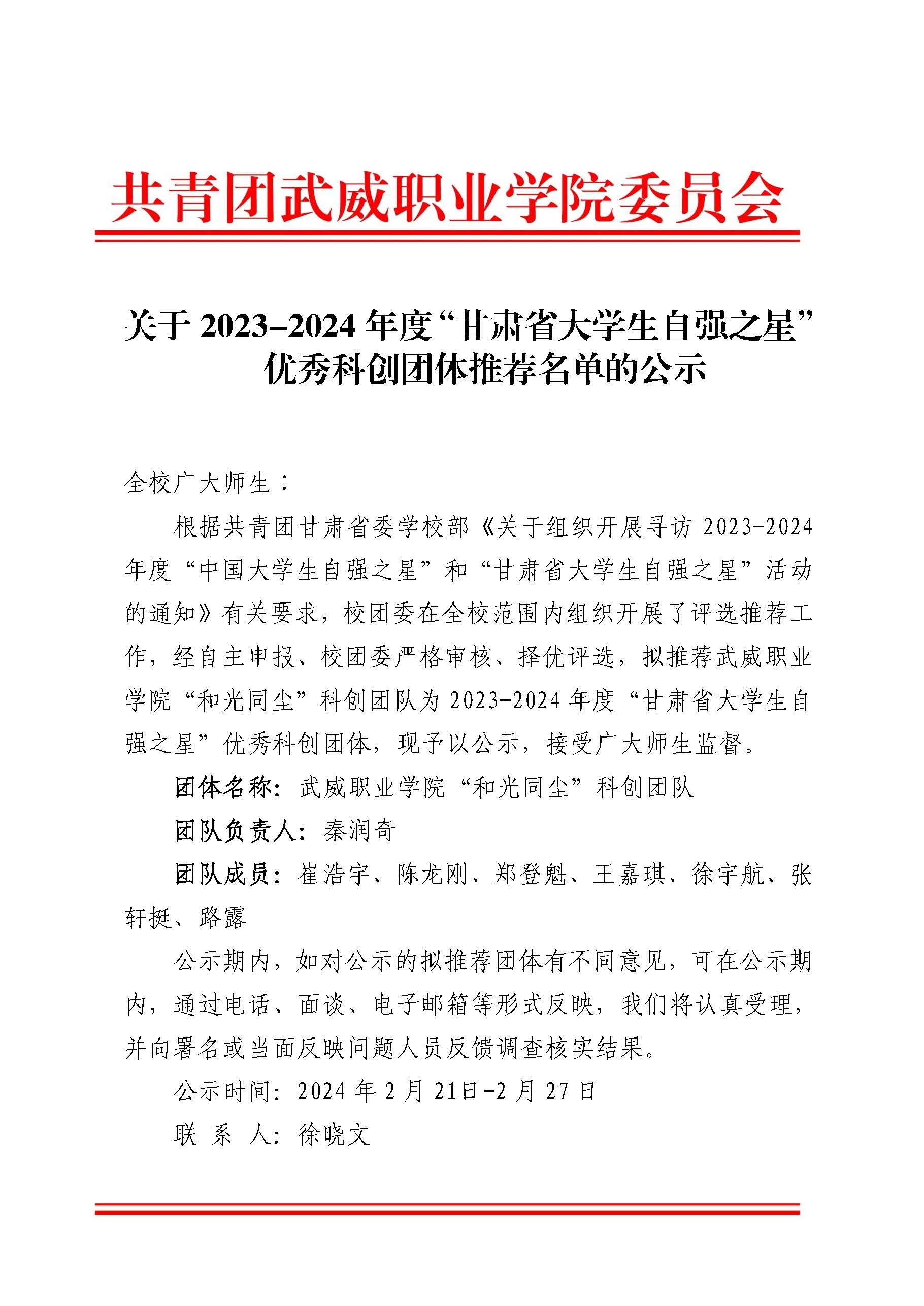 關(guān)于2023-2024年度“甘肅省大學生自強之星”優(yōu)秀科創(chuàng)團體推薦名單的公示