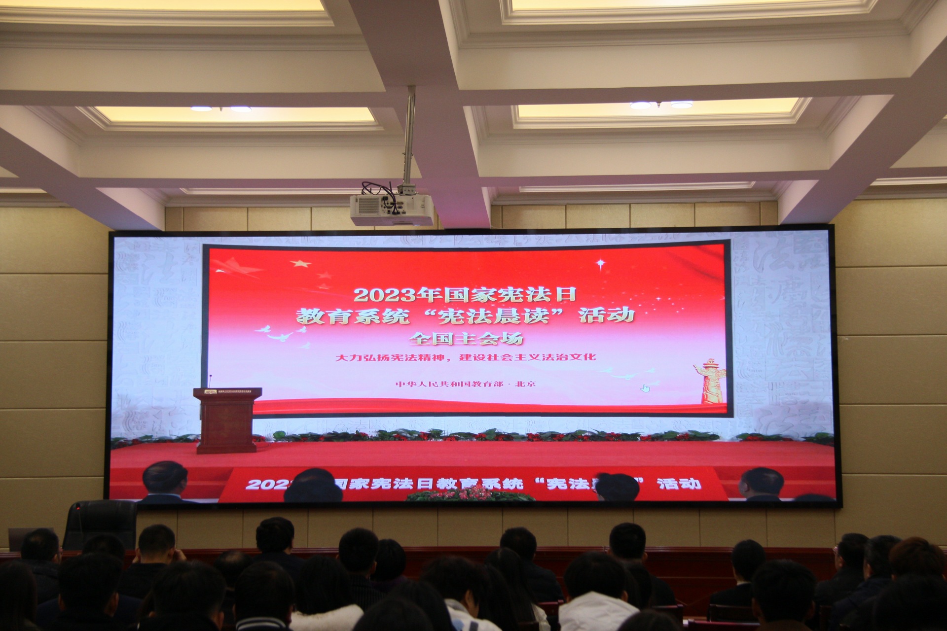 2023年12月4日是第十個(gè)國(guó)家憲法日,為深入學(xué)習(xí)貫徹黨的二十大精神,貫徹落實(shí)習(xí)近平法治思想和習(xí)近平總書記關(guān)于憲法法治教育的重要指示精神,營(yíng)造法治校園氛圍,弘揚(yáng)憲法精神,維護(hù)憲法權(quán)威,培育學(xué)生的憲法意識(shí)、國(guó)家意識(shí)、規(guī)則意識(shí)。學(xué)校在行樹樓北報(bào)告廳開展“大力弘揚(yáng)憲法精神,建設(shè)社會(huì)主義法治文化”憲法晨讀活動(dòng)。黨委委員、副校長(zhǎng)何毅參加活動(dòng)。
