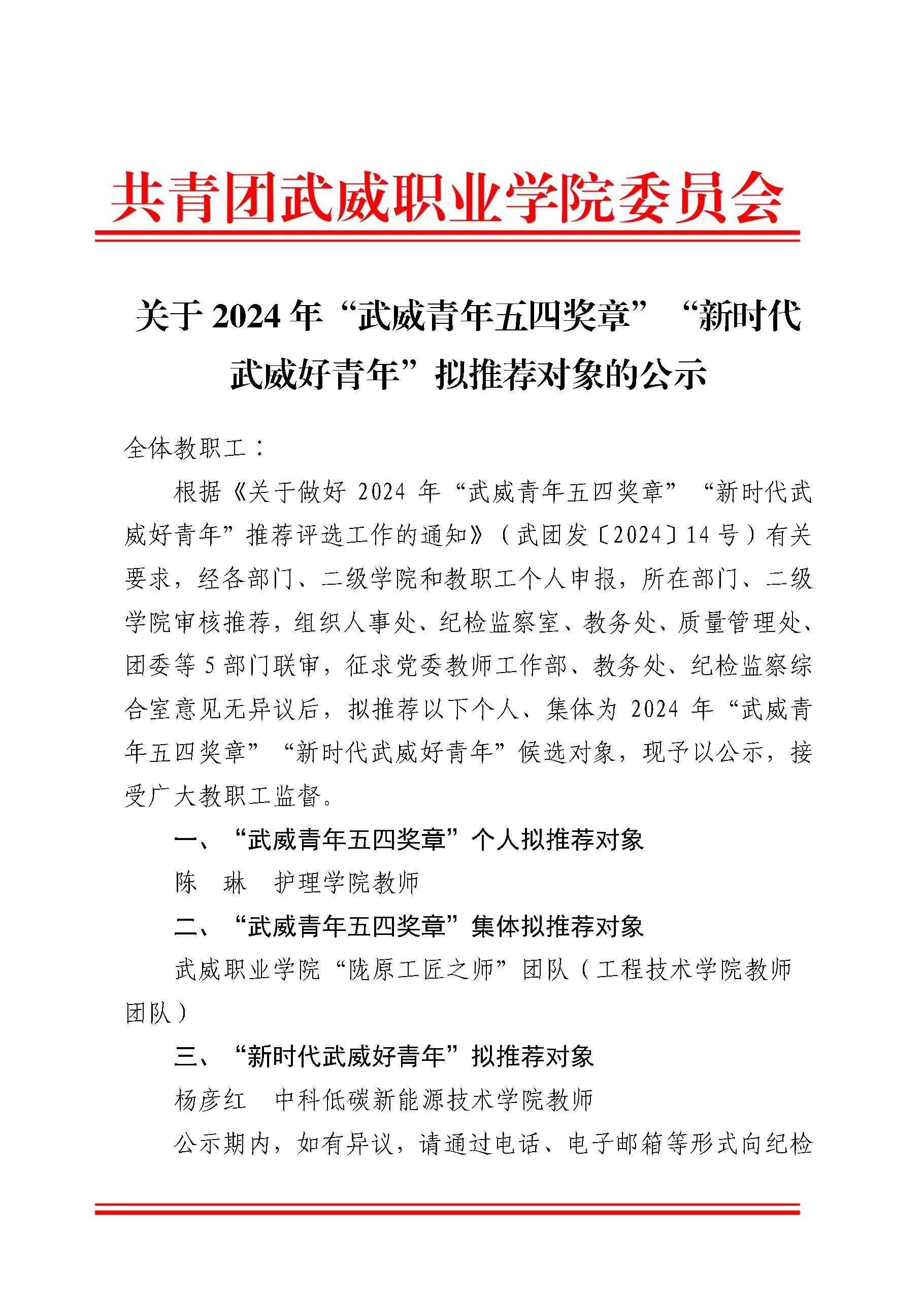 關(guān)于2024年“武威青年五四獎(jiǎng)?wù)隆啊毙聲r(shí)代武威好青年“擬推薦對(duì)象的公示