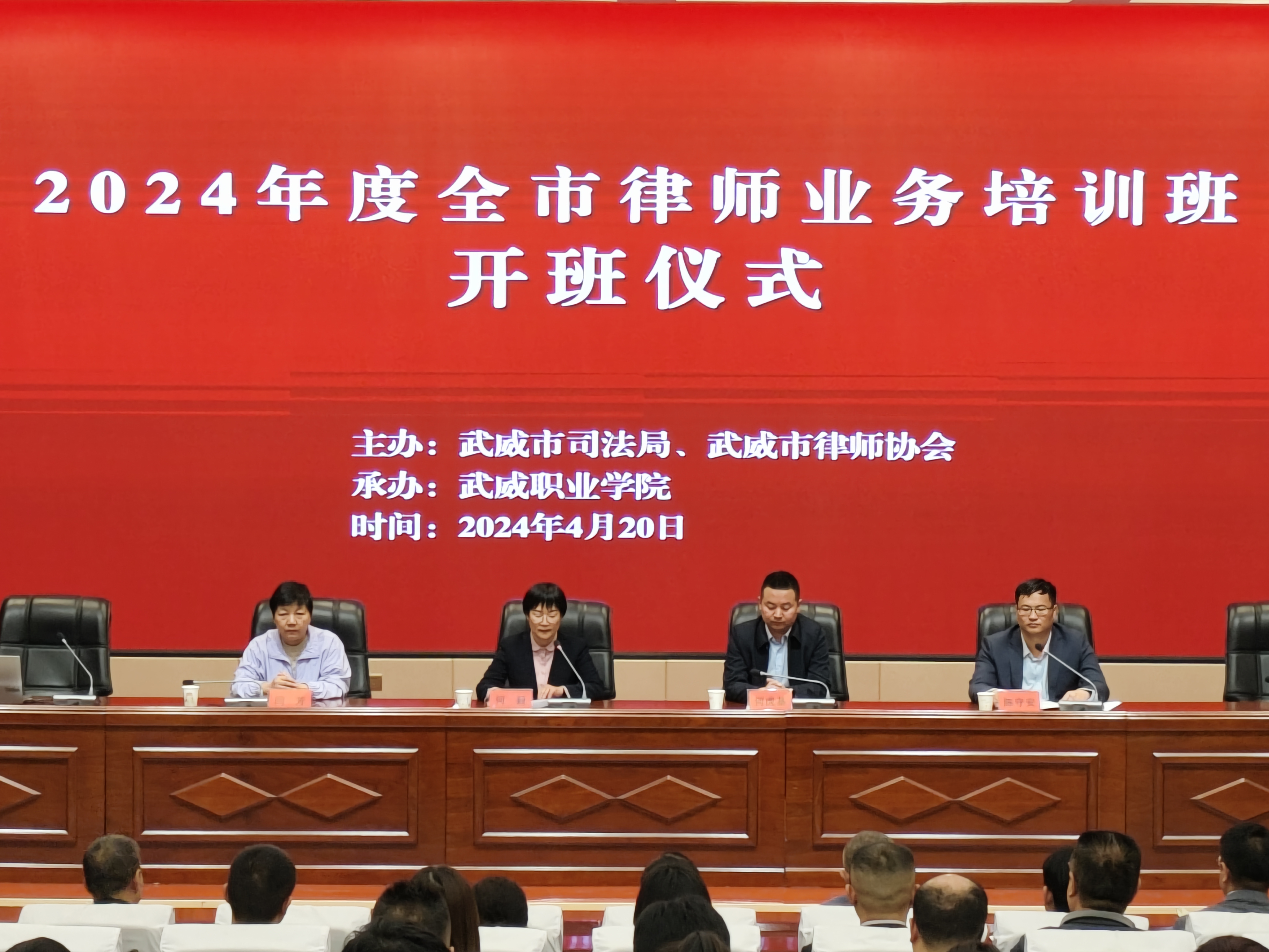 4月20日上午,由武威市司法局、武威市律師協(xié)會主辦,武威職業(yè)學院承辦的2024年度武威市律師業(yè)務培訓班在學生發(fā)展中心箐英廳舉行開班儀式。武威職業(yè)學院黨委委員、副校長何毅,武威市司法局黨組成員、副局長,市律師行業(yè)黨委書記何虎基,武威市司法局律師和法律職業(yè)資格管理科長閆芳出席開班儀式。武威市律師協(xié)會會長、市律師行業(yè)黨委副書記陳守安主持開班儀式。全市注冊的專(兼)職律師、法援律師、公職律師、公司律師及實習律師共計220人參加開班儀式。