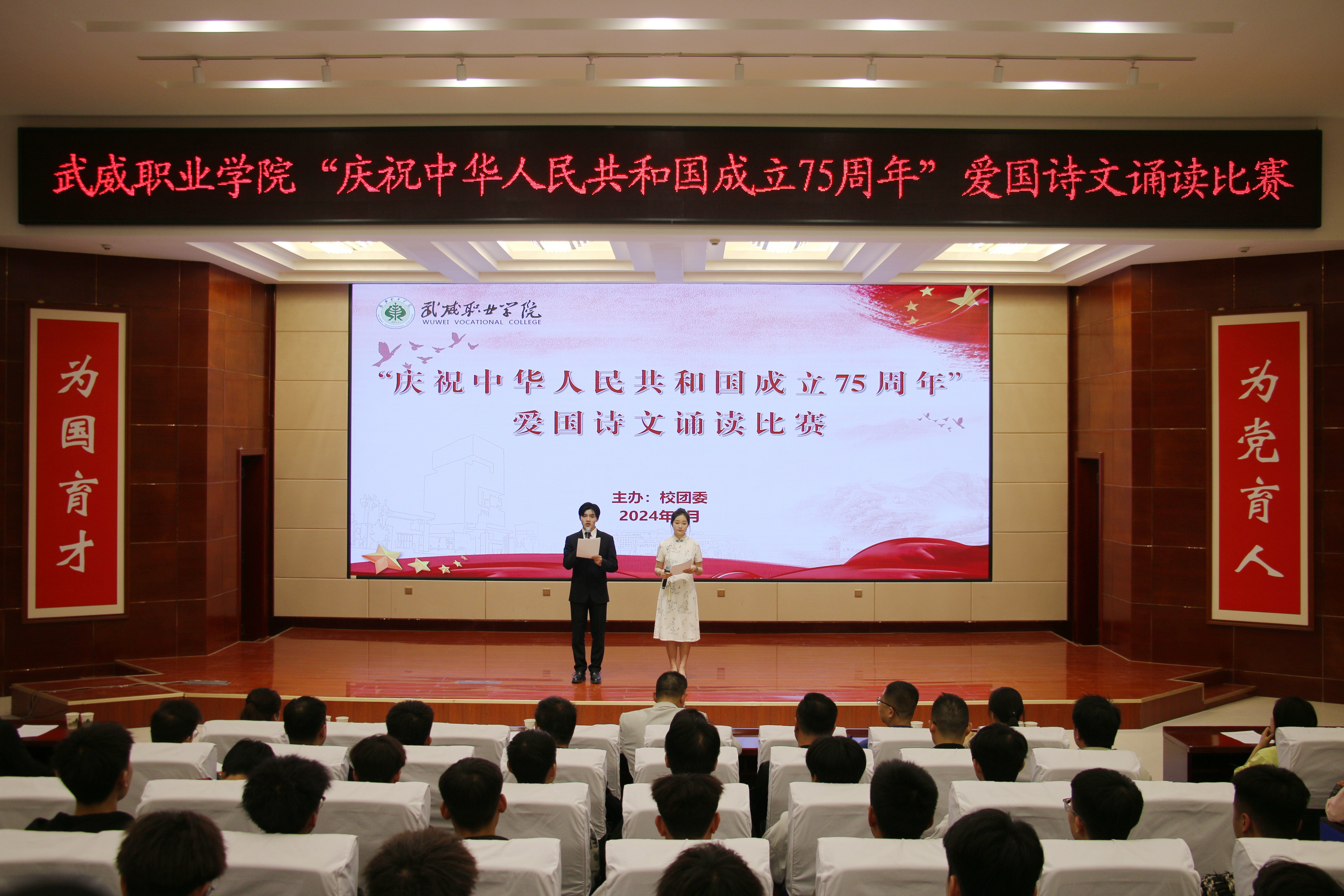 4月25日晚,學校“紀念‘五四’運動105周年暨慶祝新中國成立75周年”愛國詩文誦讀比賽在菁英廳舉辦。黨委委員、副校長王守云出席活動,各二級學院團委書記及學生代表220余人觀看比賽。