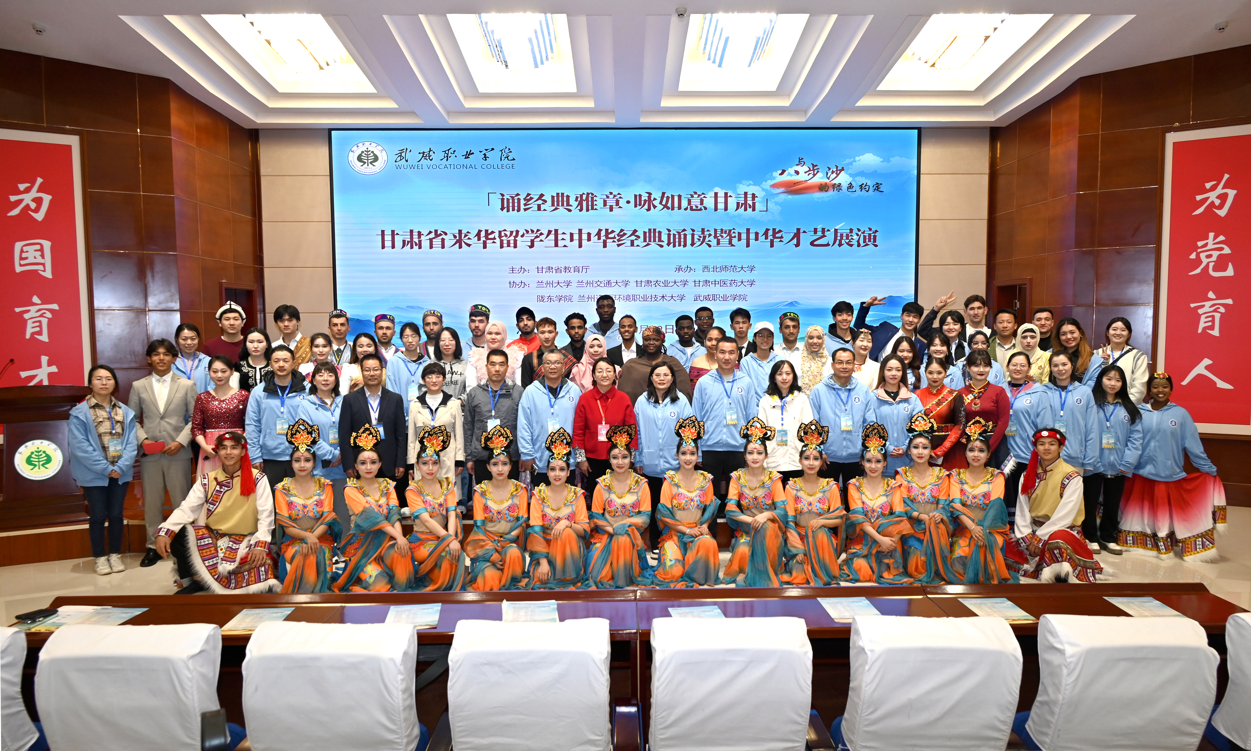 4月29日,省教育廳主辦、西北師范大學(xué)承辦的2024年甘肅省來華留學(xué)生“誦經(jīng)典雅章·詠如意甘肅”中華詩文誦讀展演活動在學(xué)校舉行。展演活動是2024年甘肅省高校留學(xué)生“感知中國-與八步沙的綠色約定”中華傳統(tǒng)文化體驗活動的分項活動之一。蘭州大學(xué)、蘭州交通大學(xué)、西北師范大學(xué)、甘肅農(nóng)業(yè)大學(xué)、甘肅中醫(yī)藥大學(xué)、隴東學(xué)院、蘭州資源環(huán)境職業(yè)技術(shù)大學(xué)、武威職業(yè)學(xué)院8所高校的來自東帝汶、萊索托、蒙古、泰國、烏茲別克斯坦、加納等16個國家的50多名留學(xué)生參加展演。黨委委員、副校長田迎春出席活動并致辭。