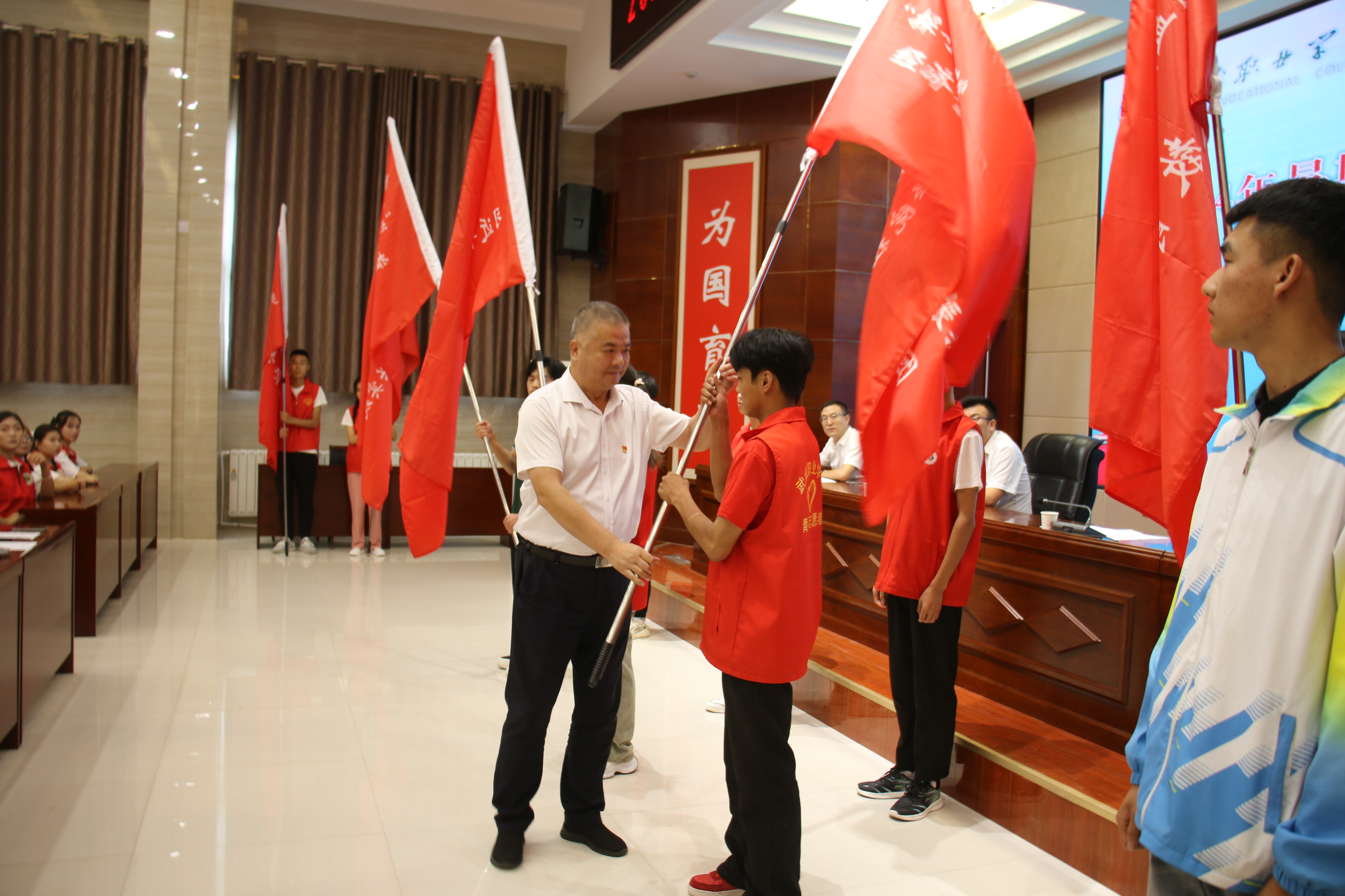 王守云為國家級和省級重點(diǎn)立項(xiàng)團(tuán)隊(duì)授旗,并對即將啟程的實(shí)踐團(tuán)隊(duì)提出三點(diǎn)希望和要求:一是要緊扣活動主題,在學(xué)思踐悟中筑牢信仰根基;二是積極探索實(shí)踐,在篤行實(shí)干中練就過硬本領(lǐng);三是主動擔(dān)當(dāng)作為,在踔厲奮發(fā)中展示武職風(fēng)采。希望同學(xué)們向下扎根、向上生長,鍛煉自我的同時,筑牢“安全防線”,高質(zhì)量開展本次社會實(shí)踐活動,收獲成長與進(jìn)步,將“三下鄉(xiāng)”活動打造為我校形象展示的重要窗口和靚麗名片。