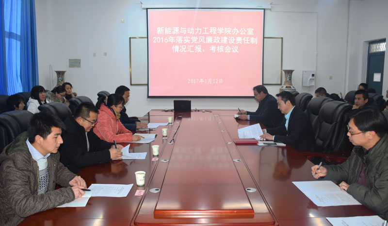 1月12日下午,學院副院長田迎春帶領學院第六考核組,對新能源與動力工程學院辦公室2016年度黨風廉政建設和反腐敗工作進行了全面檢查考核。新能源與動力工程學院全體教職工參加了會議。