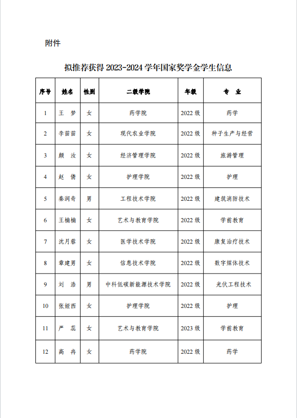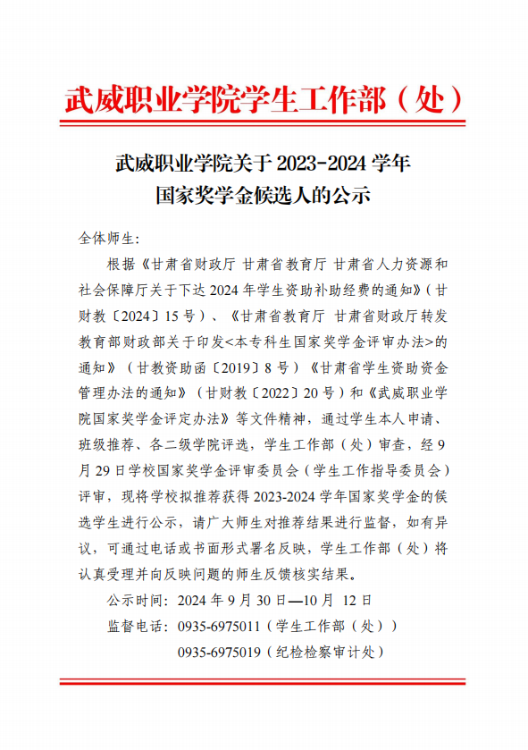 武威職業(yè)學(xué)院關(guān)于2023-2024學(xué)年國家獎(jiǎng)學(xué)金候選人的公示