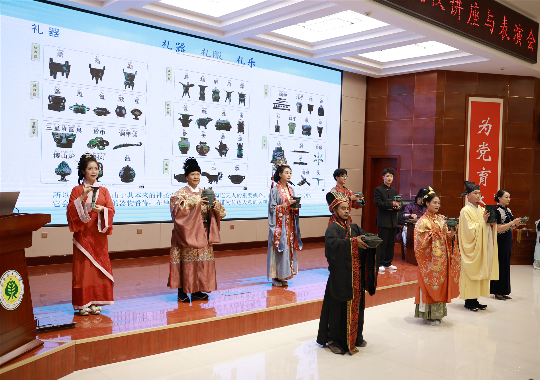 馮國春老師以深厚的學(xué)識和豐富的經(jīng)驗(yàn),詳細(xì)向?qū)W生們講解了各個(gè)歷史時(shí)期的傳統(tǒng)禮儀,從禮器、禮服到禮樂,每一個(gè)朝代都生動而詳盡。團(tuán)隊(duì)成員將禮儀通過現(xiàn)場示范的方式呈現(xiàn)給在場的每一位同學(xué)。他們不僅展示了禮儀的外在形式,更傳達(dá)了禮儀背后的文化內(nèi)涵和精神價(jià)值。