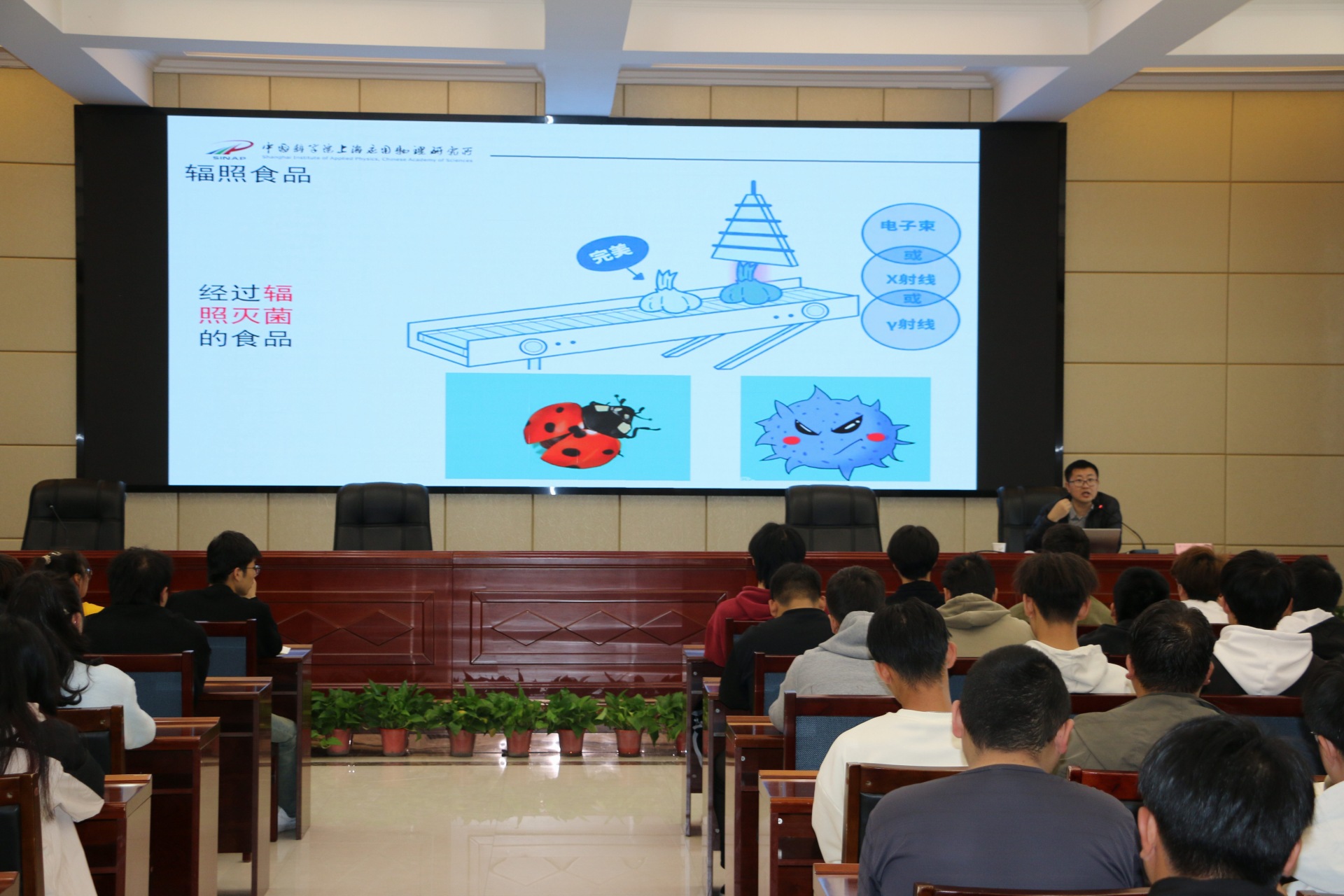 李吉豪做了題為《身入“輻”境,洞悉其益——輻照技術(shù),點(diǎn)亮生活之光》的報(bào)告,從輻射技術(shù)概述科普、輻照技術(shù)在農(nóng)業(yè)領(lǐng)域的應(yīng)用、輻照技術(shù)在高分子化工領(lǐng)域的應(yīng)用等三個(gè)方面對(duì)輻照技術(shù)的前沿應(yīng)用進(jìn)行了生動(dòng)的講解,現(xiàn)場師生大受裨益,也讓學(xué)生對(duì)自己所學(xué)相關(guān)專業(yè)有了更加深刻的理解,同時(shí)激發(fā)了同學(xué)們對(duì)專業(yè)知識(shí)的學(xué)習(xí)熱情。
