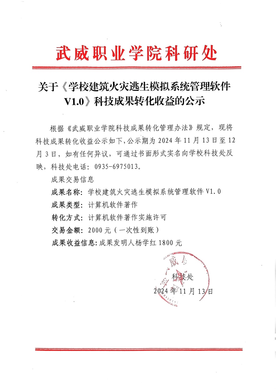 關于《學校建筑火災逃生模擬系統(tǒng)管理軟件V1.0》科技成果轉化收益的公示