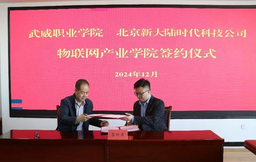樊斌和翟存祥簽署《武威職業(yè)學(xué)院 北京新大陸時代科技公司產(chǎn)教融合合作協(xié)議》。