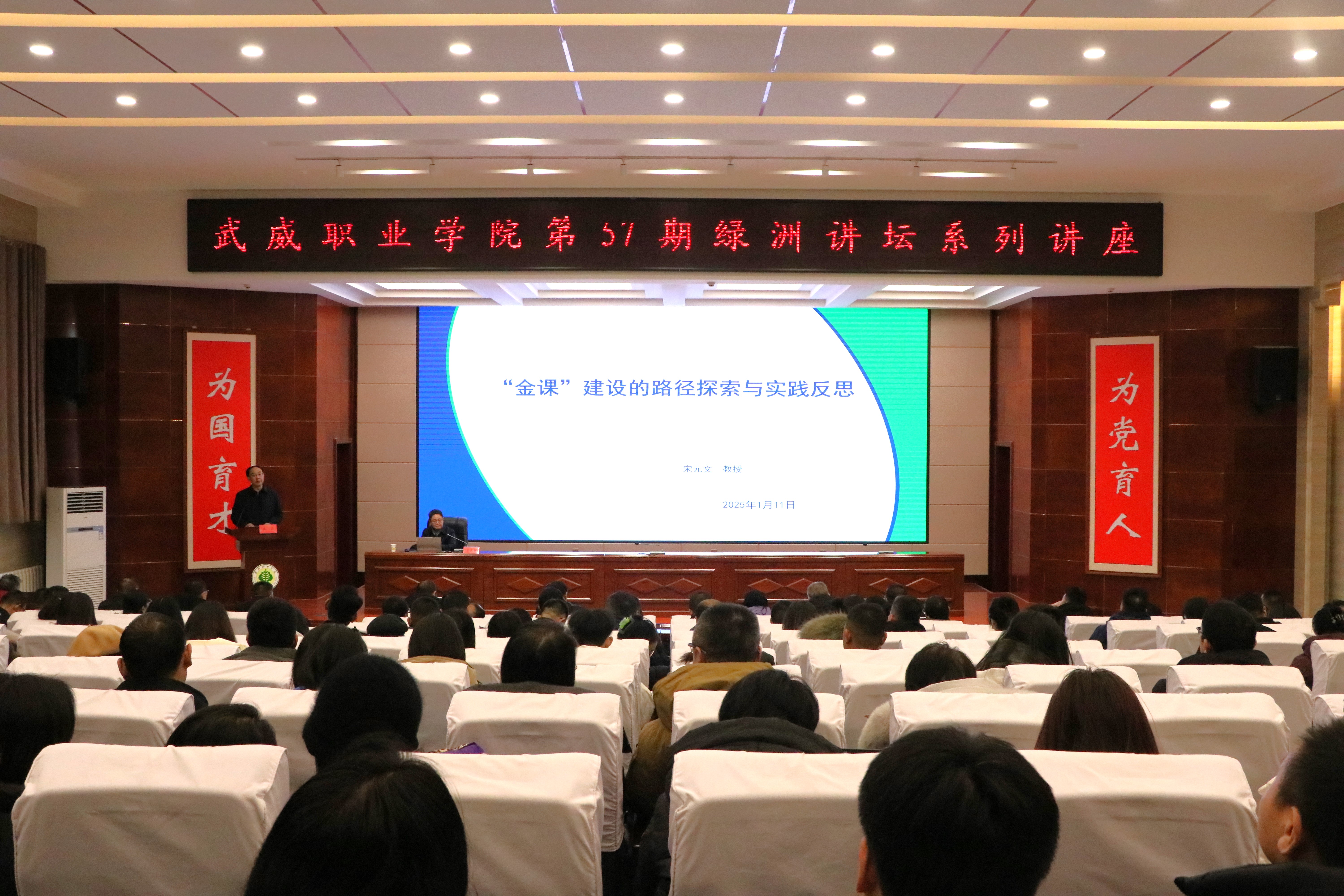 1月11日下午,學(xué)校特邀原蘭州資源環(huán)境職業(yè)技術(shù)大學(xué)副校長(zhǎng)宋元文教授在菁英廳作了《“金課”建設(shè)的實(shí)踐反思與路徑探索》主題講座。講座由學(xué)校黨委書記王宏主持,學(xué)校領(lǐng)導(dǎo)、中層管理干部、教研室主任及教師代表共210余人參加。