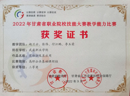 趙蘭云、張偉、 付江鵬、李玉榮 | 定積分及其應用 | 省級 | 三等 |