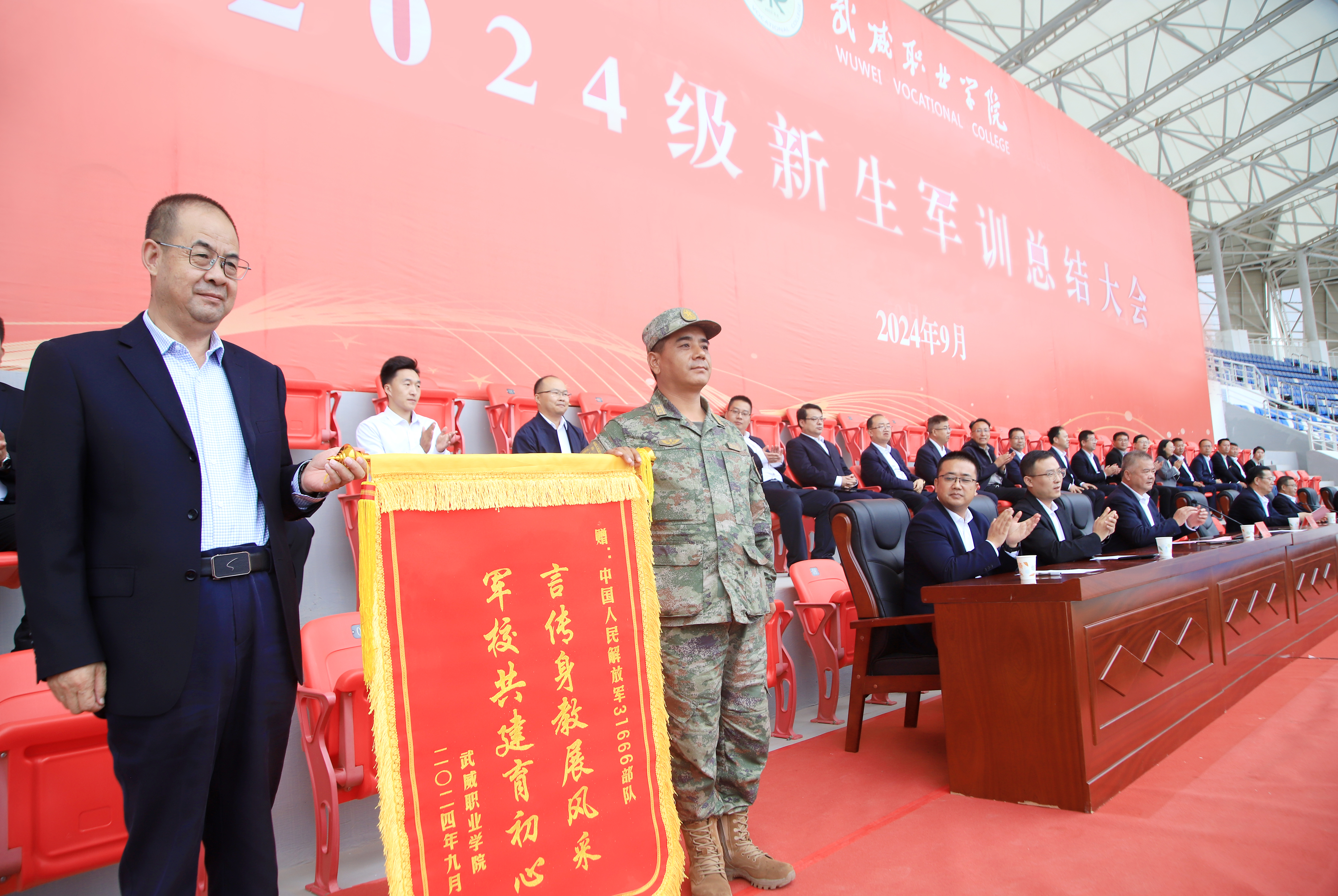 金秋的校園青春閃亮,挺拔的軍姿威嚴豪放。9月18日下午,學校2024級新生軍訓總結大會在體育場隆重舉行。校長、黨委副書記張開禮,黨委副書記翟存祥,黨委委員、紀委書記、監(jiān)察專員陳曉煜,31666部隊陸軍中校謝紹璞出席大會。會議由黨委委員、副校長王守云主持。