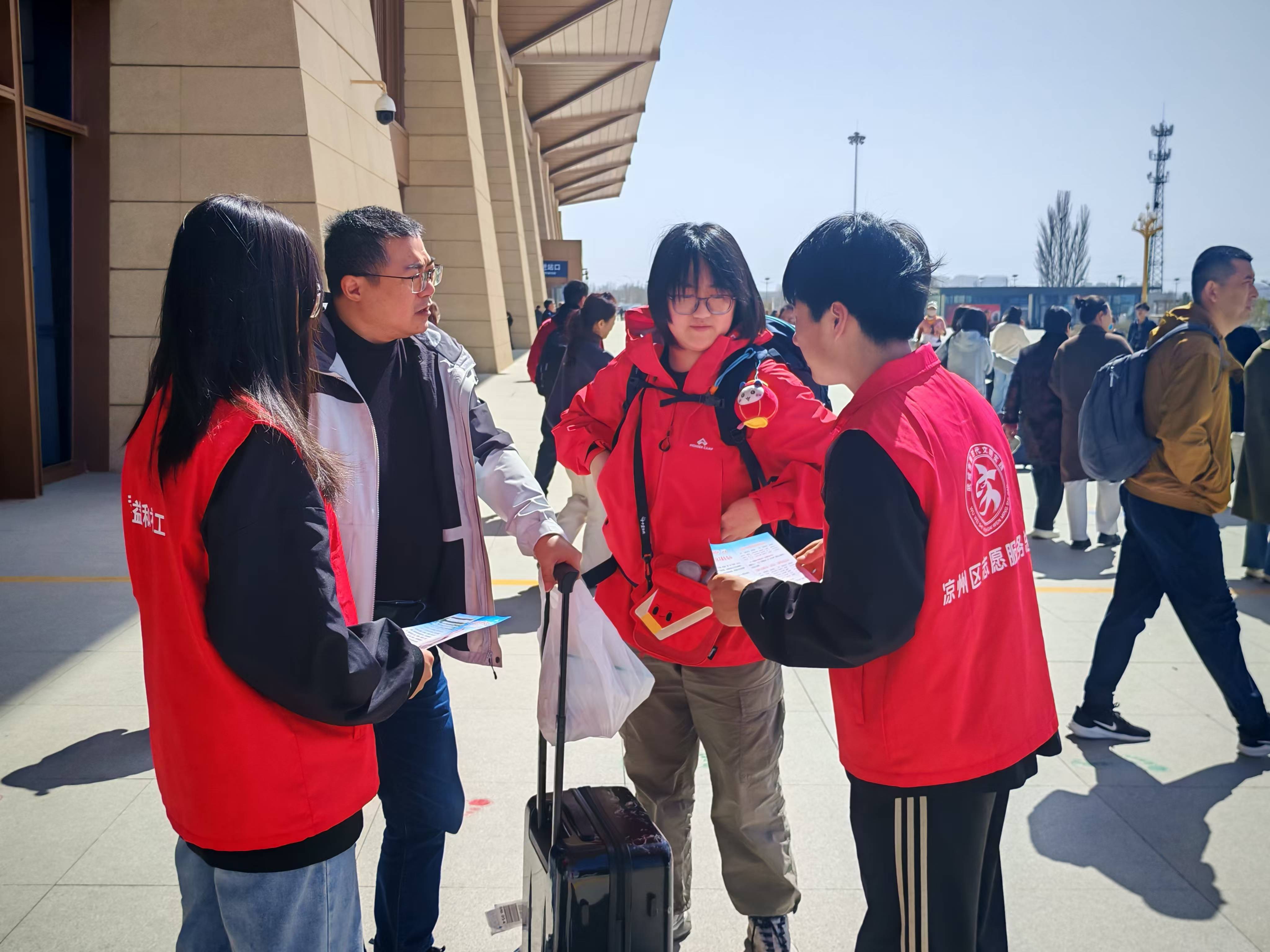 在志愿服務(wù)站點(diǎn),志愿者們身穿紅馬甲,化身“沙漠綠洲向?qū)А?,?gòu)成一道暖心風(fēng)景線。他們熱情地為遠(yuǎn)道而來(lái)的全國(guó)各地植樹(shù)志愿者們提供暖心引導(dǎo),熱情細(xì)致告知前往民勤的乘車路線、換乘信息和注意事項(xiàng),并協(xié)助搬運(yùn)行李,引導(dǎo)植樹(shù)志愿者們有序乘車,用實(shí)際行動(dòng)詮釋了新時(shí)代青年的責(zé)任與擔(dān)當(dāng)。