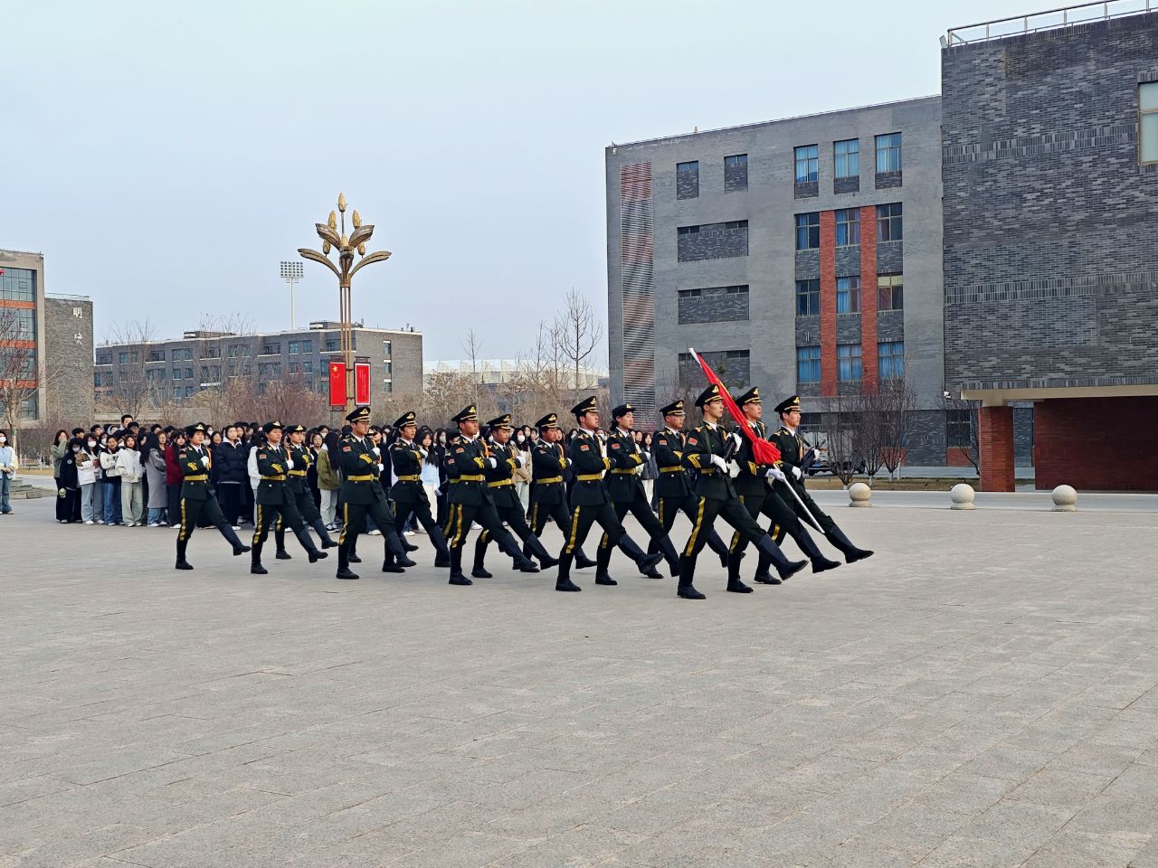 隨著激昂的國歌響起,英姿颯爽的國旗護(hù)衛(wèi)隊邁著整齊有力的步伐,護(hù)送五星紅旗走向升旗臺。在全體師生莊嚴(yán)肅穆的注目下,鮮艷的五星紅旗迎著朝陽冉冉升起,隨風(fēng)飄揚。這一刻,現(xiàn)場每一個人心中的愛國之情都被深深點燃。