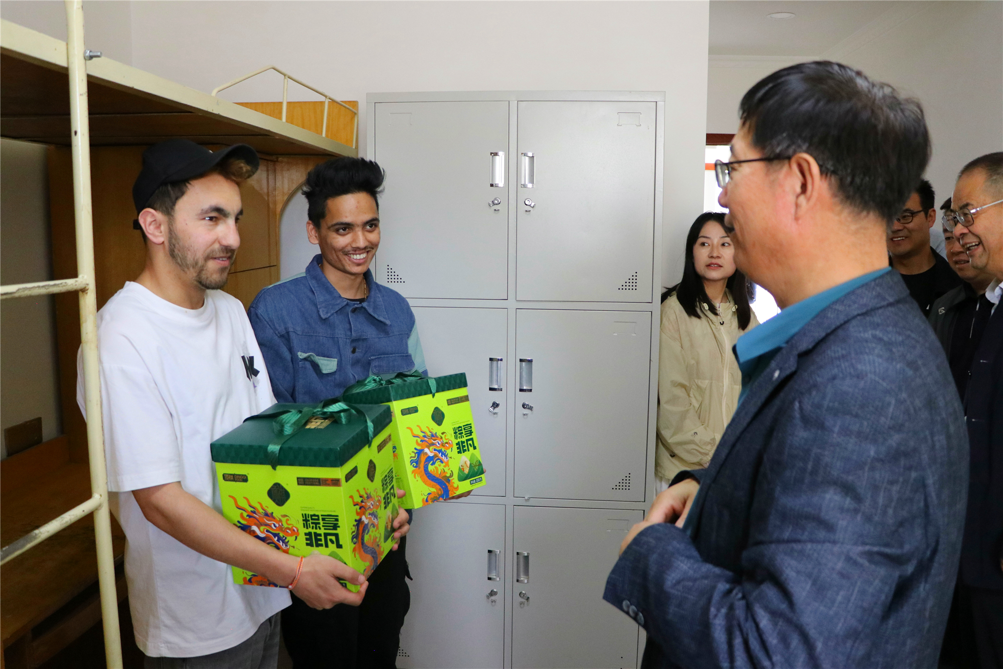 端午將至,為更好開展留學(xué)生教育管理工作,使我校來華留學(xué)生更好地認(rèn)識(shí)和體驗(yàn)中國傳統(tǒng)節(jié)日文化,5月30日,學(xué)校黨委副書記、副校長張開禮,黨委副書記翟存祥,黨委委員、副校長王守云一行與國際合作交流處全體工作人員走進(jìn)留學(xué)生公寓,給留學(xué)生們送去節(jié)日的關(guān)懷和溫暖。