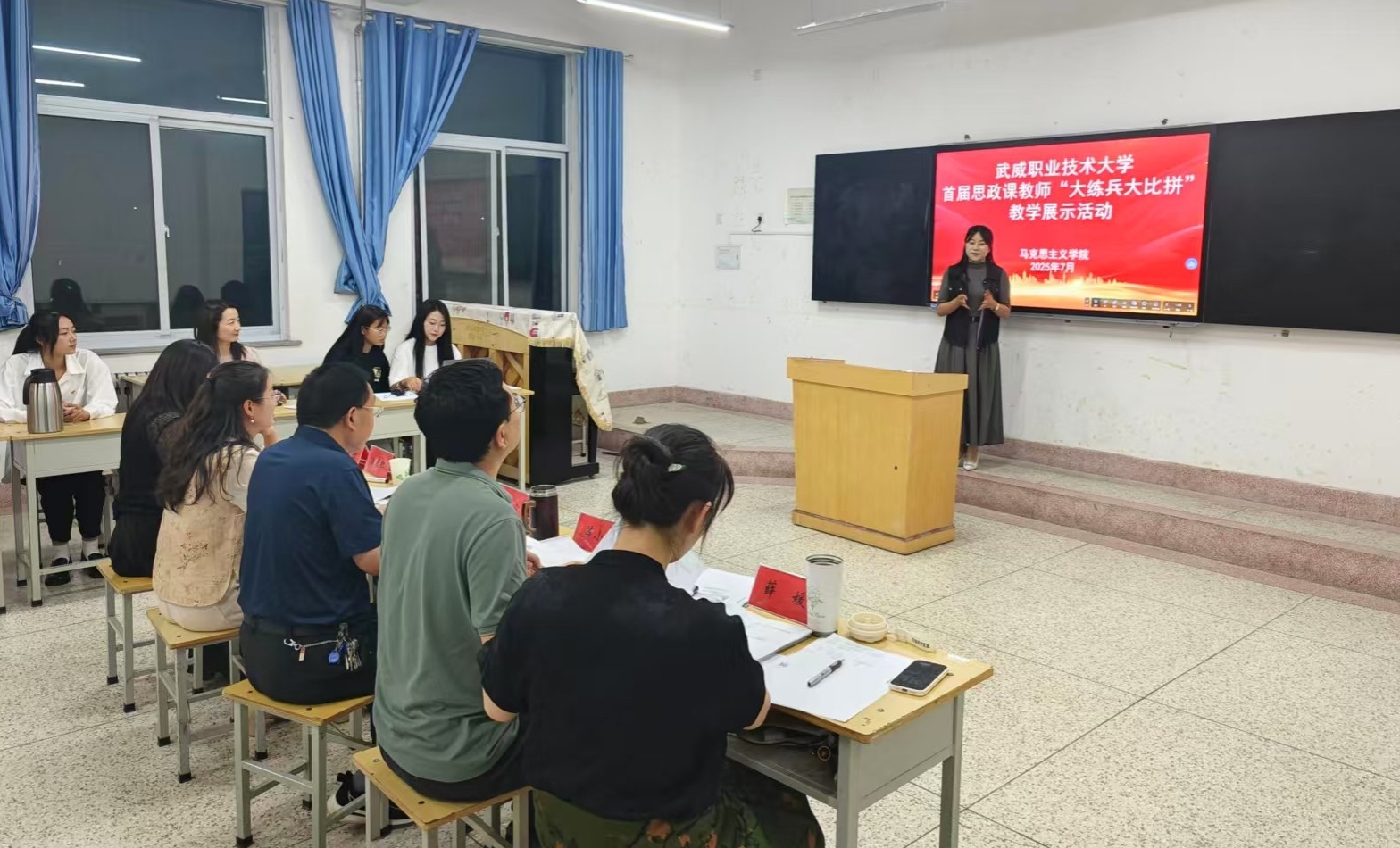7月3日,武威職業(yè)技術(shù)大學(xué)首屆思政課教師“大練兵大比拼”教學(xué)展示活動(dòng)在勵(lì)勤樓206教室成功舉辦?;顒?dòng)旨在推動(dòng)新時(shí)代思想政治理論課高質(zhì)量發(fā)展,提升思政課教師教學(xué)水平,打造高素質(zhì)思政課教師隊(duì)伍。