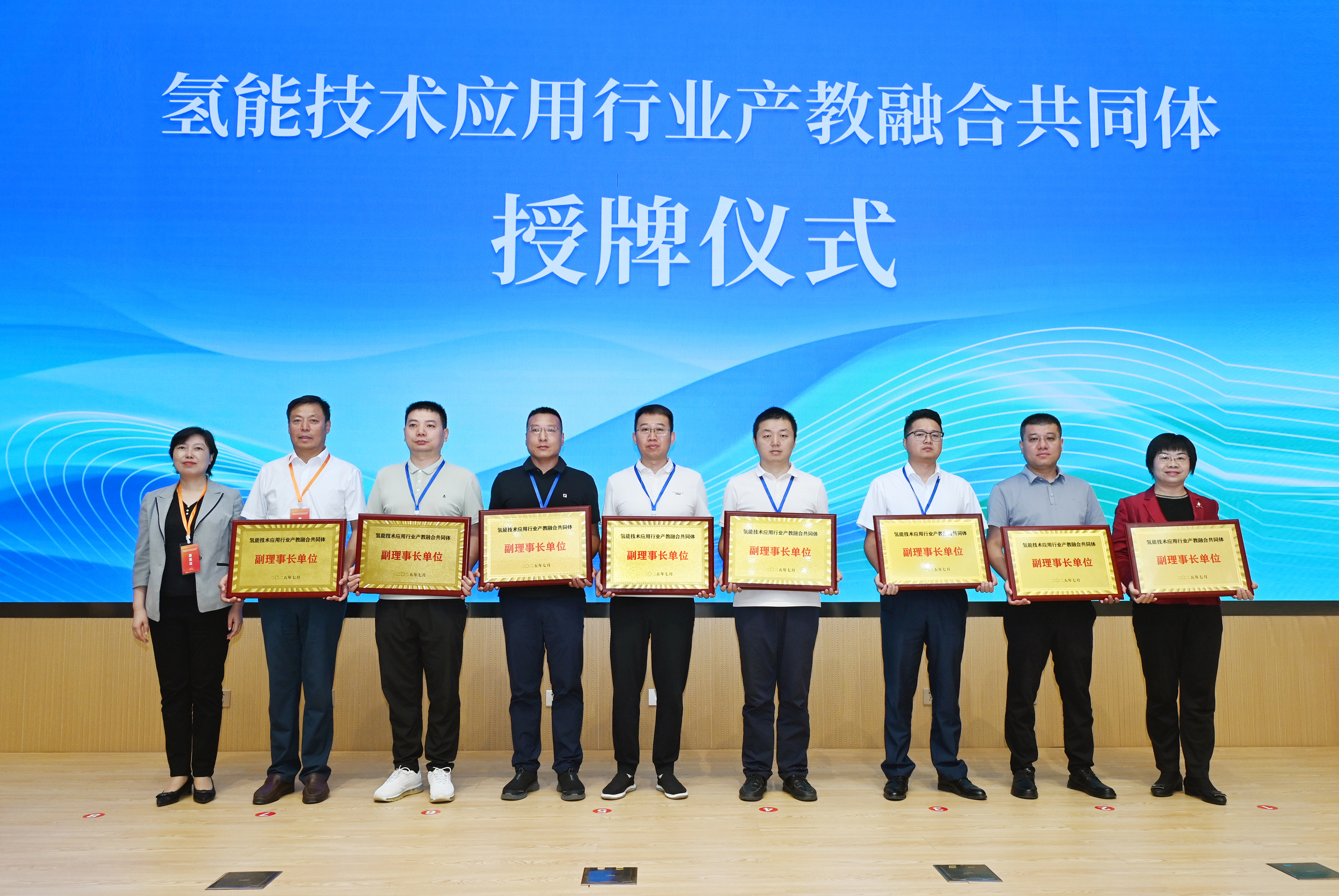 啟動儀式上,與會領(lǐng)導(dǎo)共同點(diǎn)亮啟動球,宣布?xì)淠芗夹g(shù)應(yīng)用行業(yè)產(chǎn)教融合共同體正式成立。大會公布了共同體理事會成員單位名單,并為理事長單位、副理事長單位授牌。