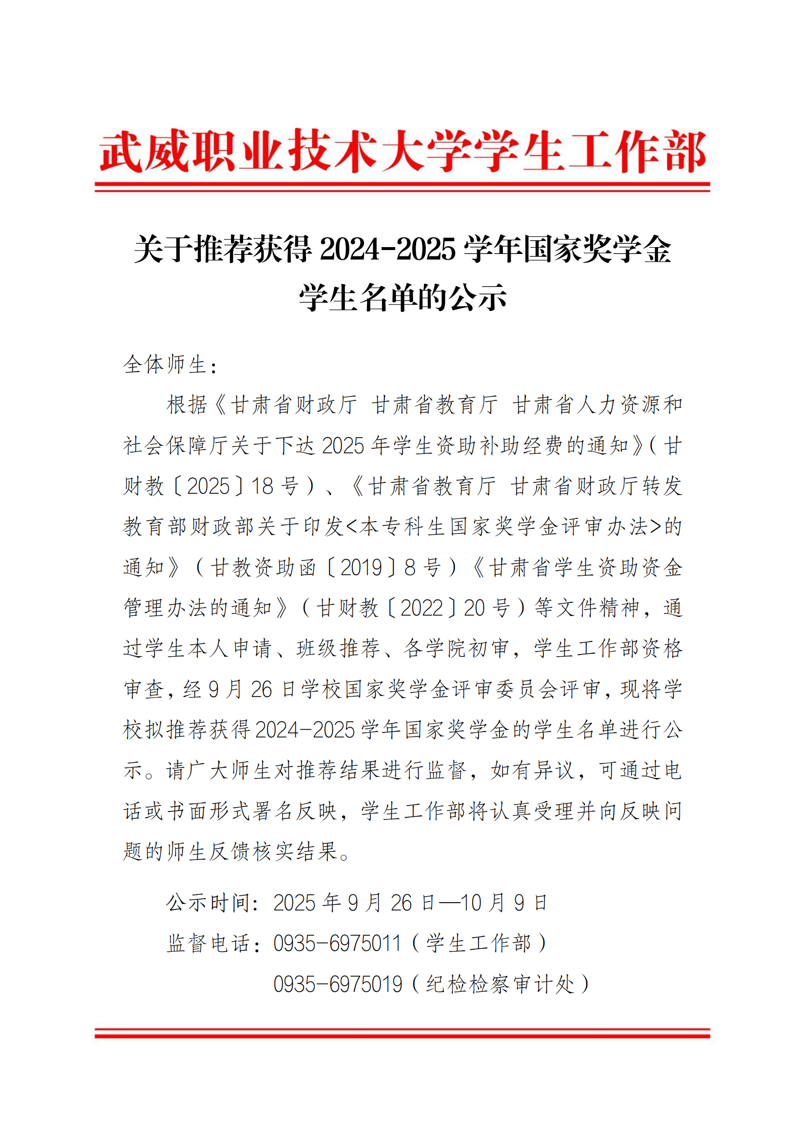 甘肅省武威師范學校關于2025-2026學年國家助學金評選結果的公示