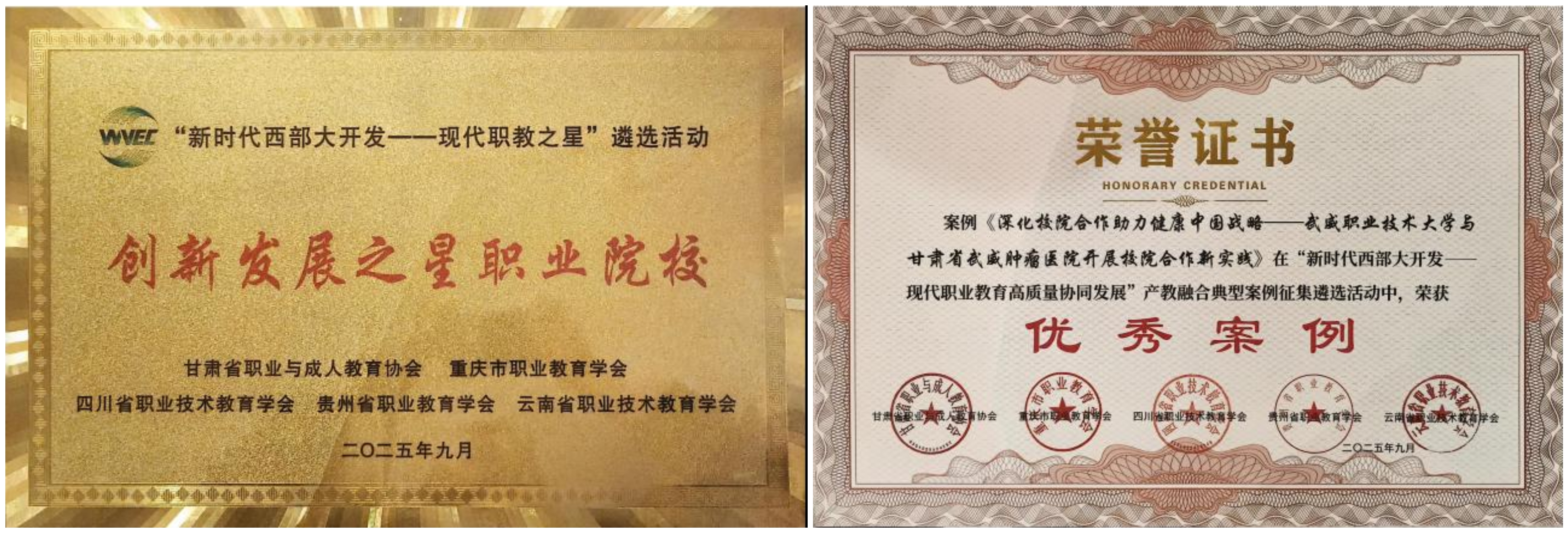 近日,從“新時(shí)代西部大開(kāi)發(fā)——現(xiàn)代職業(yè)教育高質(zhì)量協(xié)同發(fā)展(蘭州)大會(huì)”上傳來(lái)喜訊,武威職業(yè)技術(shù)大學(xué)在甘肅省職業(yè)與成人教育協(xié)會(huì)組織的“新時(shí)代西部大開(kāi)發(fā)——現(xiàn)代職教之星”和“新時(shí)代西部大開(kāi)發(fā)——產(chǎn)教融合典型案例”征集遴選活動(dòng)中榮獲兩項(xiàng)重要榮譽(yù)。學(xué)校獲評(píng)“創(chuàng)新發(fā)展之星職業(yè)院?!?,《深化校院合作助力健康中國(guó)戰(zhàn)略——武威職業(yè)技術(shù)大學(xué)與甘肅省武威腫瘤醫(yī)院開(kāi)展校院合作新實(shí)踐》榮獲“產(chǎn)教融合典型案例優(yōu)秀案例”。