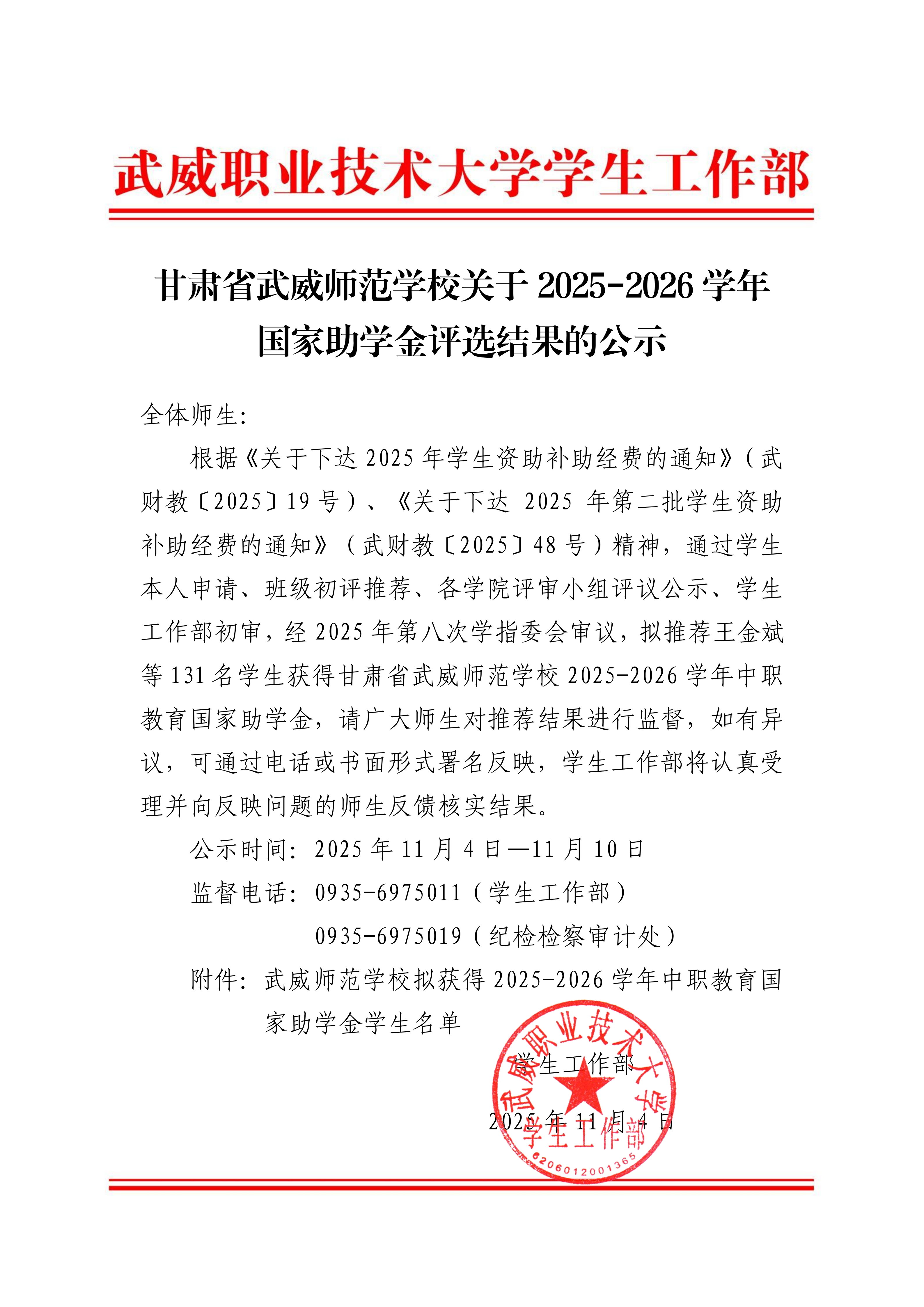 甘肅省武威師范學(xué)校關(guān)于2025-2026學(xué)年國(guó)家助學(xué)金評(píng)選結(jié)果的公示