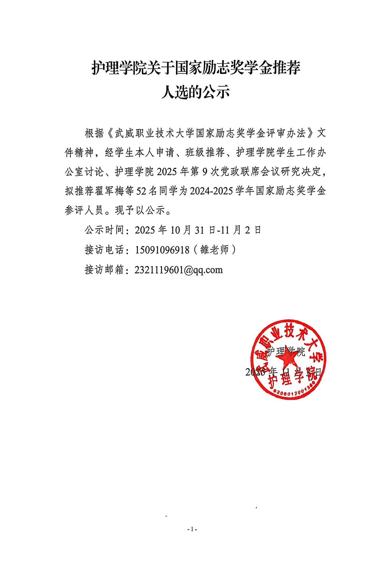 護理學院關(guān)于國家勵志獎學金推薦人選的公示
