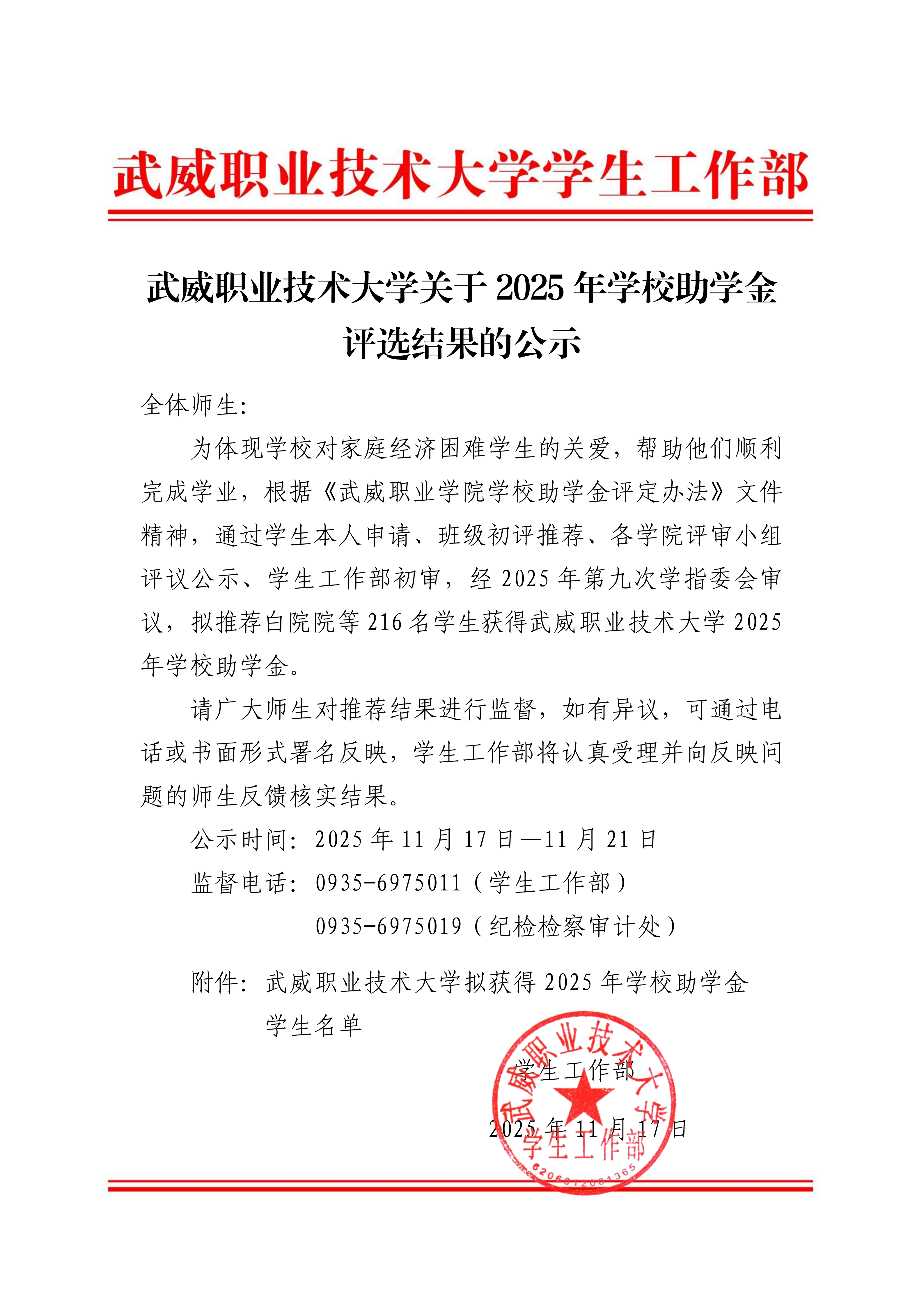 武威職業(yè)技術(shù)大學(xué)關(guān)于2025年學(xué)校助學(xué)金評(píng)選結(jié)果的公示