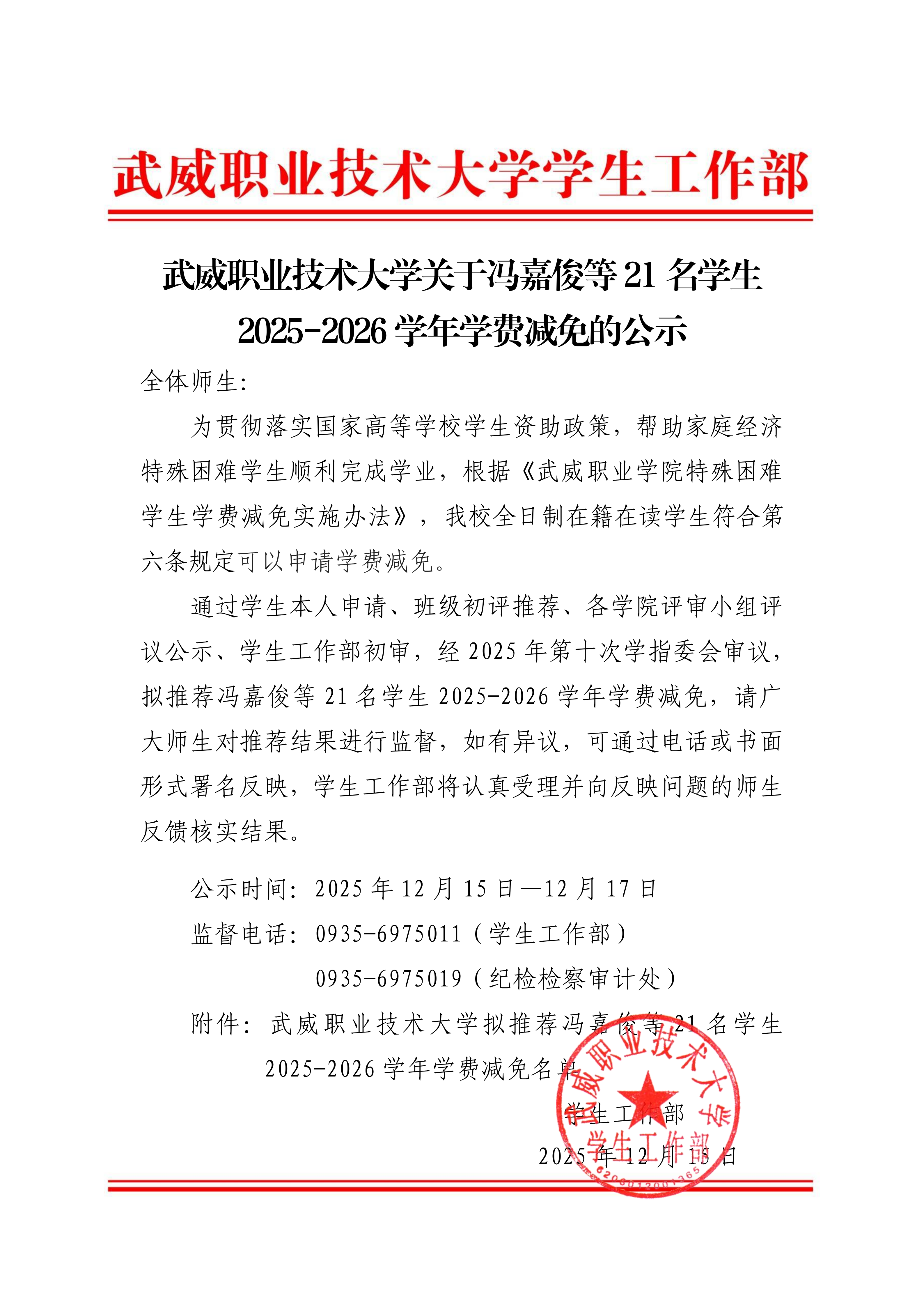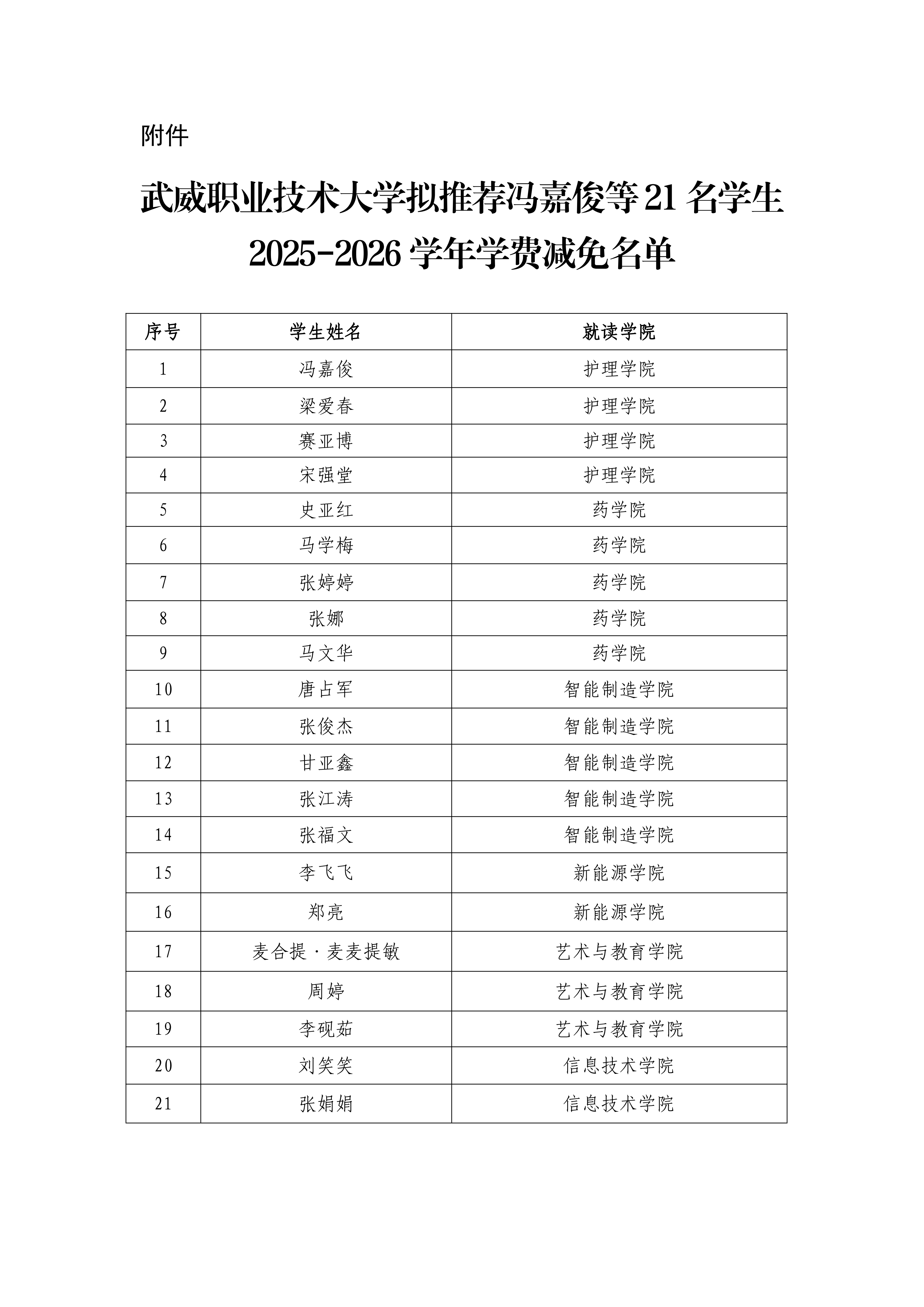 武威職業(yè)技術(shù)大學(xué)關(guān)于馮嘉俊等21名學(xué)生2025-2026學(xué)年學(xué)費(fèi)減免的公示