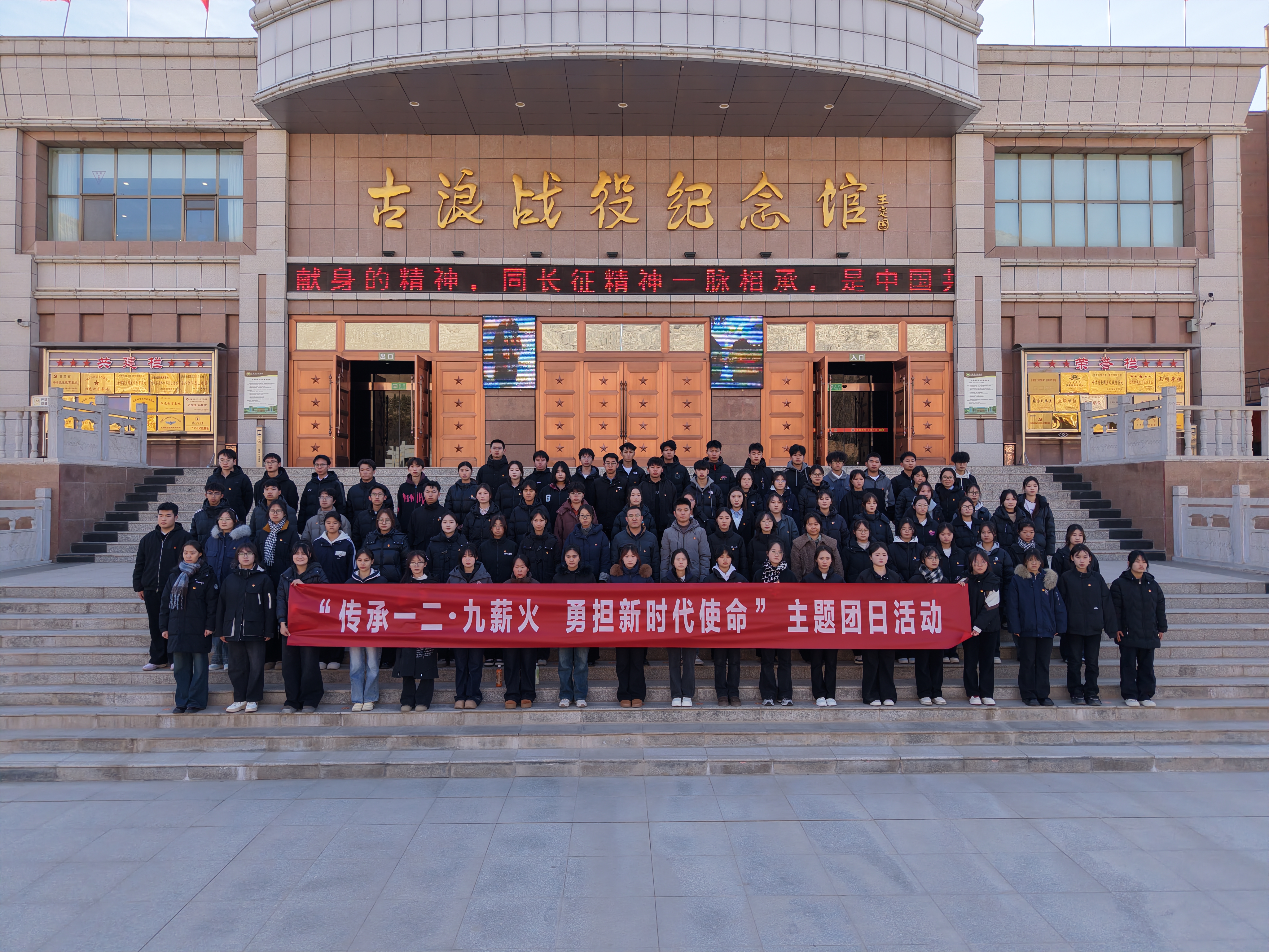 為深切緬懷革命先烈,弘揚(yáng)愛國主義精神,加強(qiáng)團(tuán)員青年思想政治引領(lǐng),12月6日,學(xué)校團(tuán)委在古浪戰(zhàn)役紀(jì)念館組織開展紀(jì)念“一二 · 九”運(yùn)動主題團(tuán)日活動暨新發(fā)展團(tuán)員集中入團(tuán)儀式。學(xué)校團(tuán)委全體干部,2025年下半年新發(fā)展團(tuán)員代表,團(tuán)學(xué)干部代表共計100人參加了活動。
