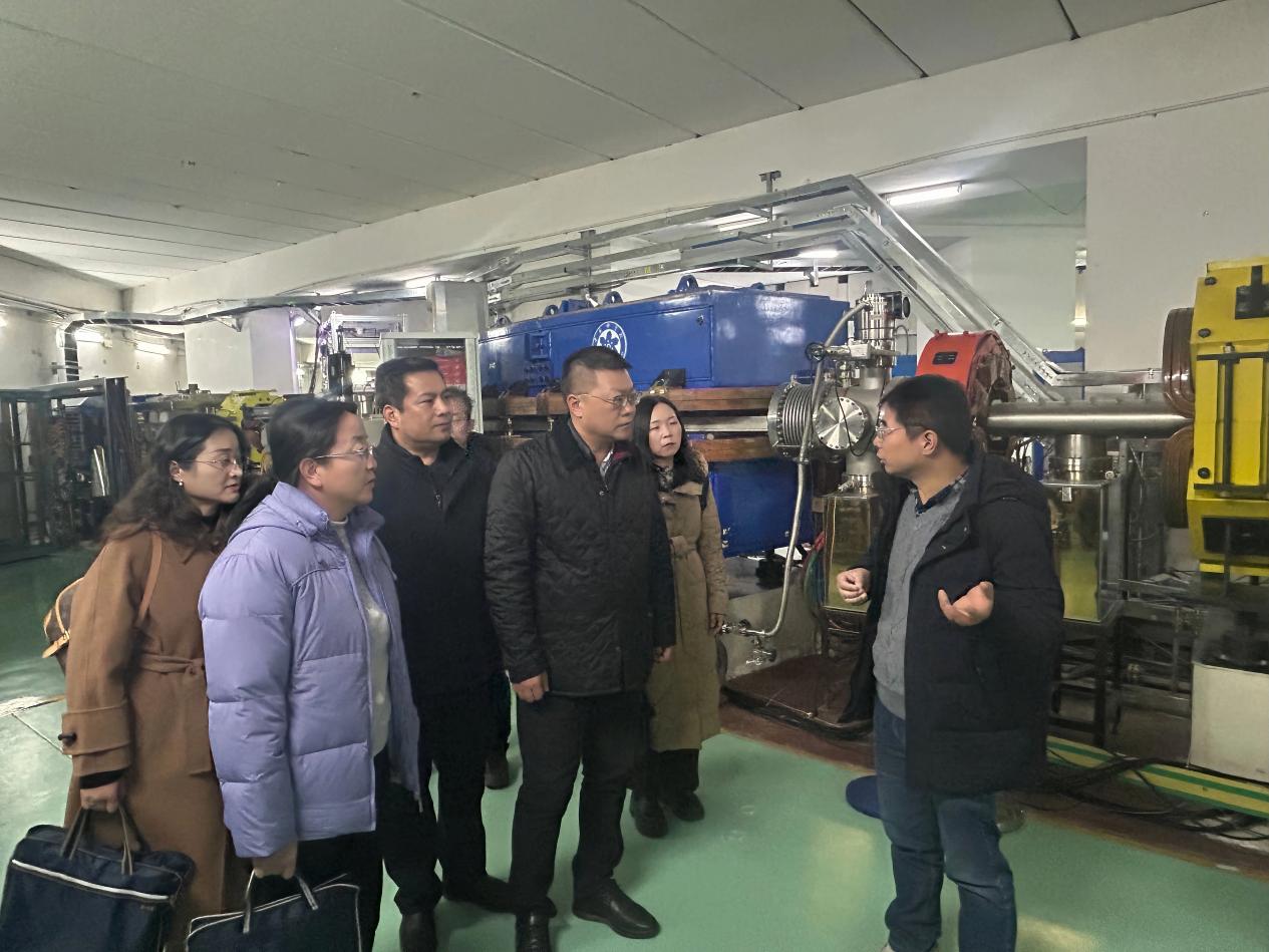 隨后,在醫(yī)用探測(cè)器室主任毛瑞士與副主任徐治國(guó)的陪同下,調(diào)研組實(shí)地參觀了“國(guó)之重器”——蘭州重離子加速器裝置,詳細(xì)了解了其結(jié)構(gòu)組成、運(yùn)行機(jī)制與核心技術(shù)原理。毛瑞士結(jié)合該裝置在重離子醫(yī)用探測(cè)器研發(fā)、醫(yī)用束測(cè)控制等領(lǐng)域的實(shí)際應(yīng)用,闡釋了核探測(cè)技術(shù)對(duì)提升醫(yī)學(xué)診療精度的支撐作用,使調(diào)研組成員切身感受到大科學(xué)裝置的科技魅力與實(shí)用價(jià)值。