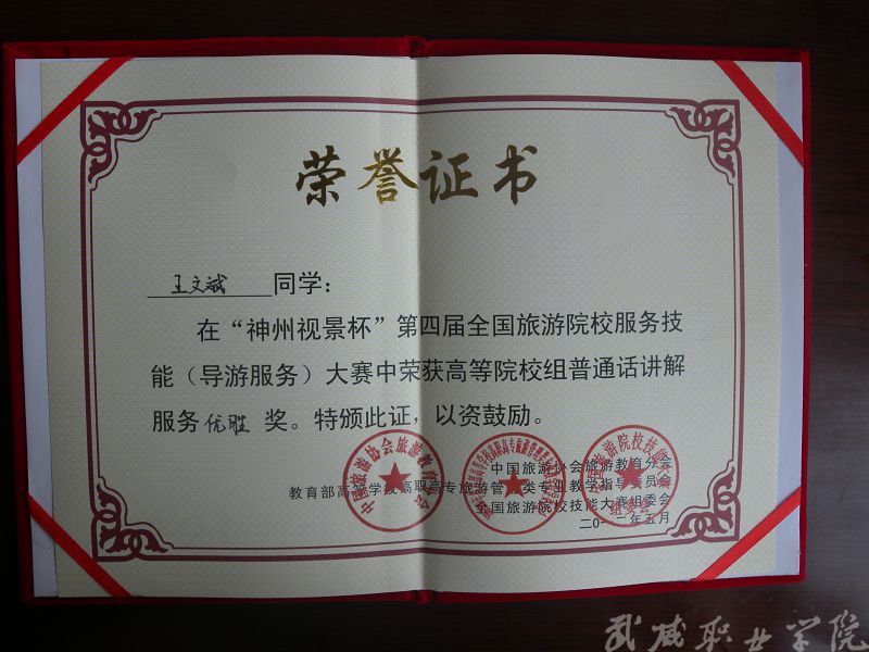 經(jīng)濟管理系晉藝波老師指導我系旅游管理、酒店管理專業(yè)學生參加2012年“神州視景杯”第四屆全國旅游院校服務技能(導游技能)大賽,榮獲優(yōu)秀獎。