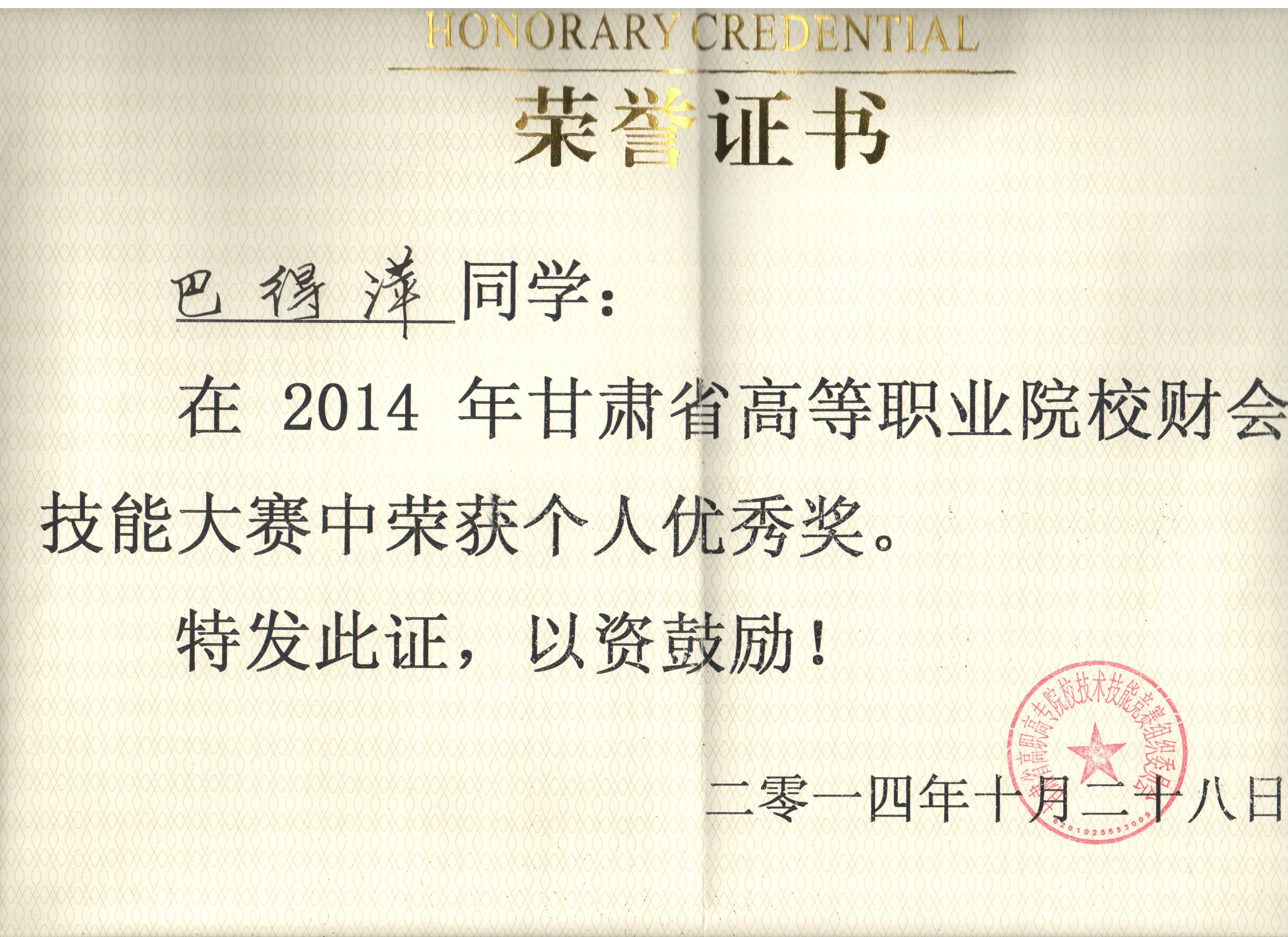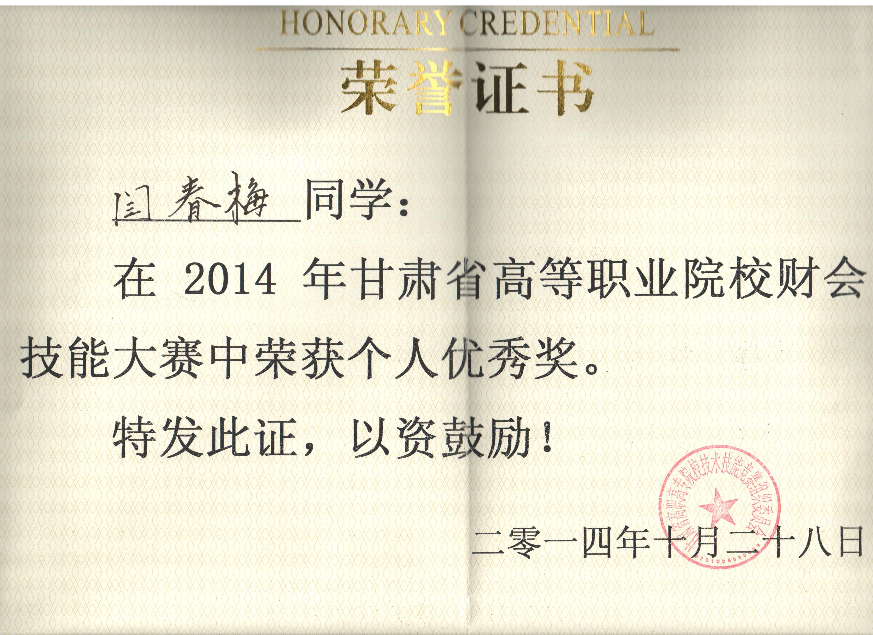 經(jīng)濟(jì)管理系李惠蘭、賀德赟老師指導(dǎo)我系會計(jì)專業(yè)學(xué)生參加2014年甘肅省高等職業(yè)學(xué)院財(cái)會技能大賽,榮獲優(yōu)秀獎。