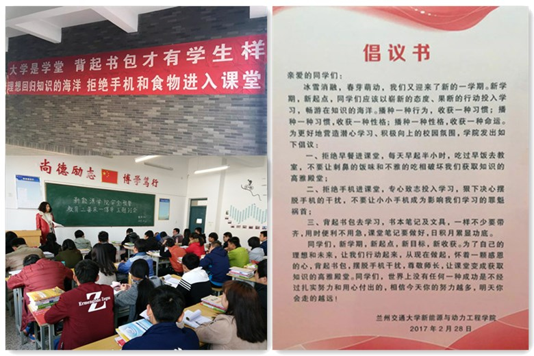 學(xué)院學(xué)生工作辦公室針對(duì)“三要求一倡導(dǎo)”的具體內(nèi)容制作、懸掛了“大學(xué)是學(xué)堂,背起書(shū)包才有學(xué)生樣”、“理想回歸知識(shí)的海洋,拒絕手機(jī)和食物進(jìn)入課堂”的橫幅,并對(duì)“三要求一倡導(dǎo)”活動(dòng)在全院范圍發(fā)起倡議,在教學(xué)樓和公寓樓分別粘貼了倡議書(shū),營(yíng)造氛圍,讓學(xué)生們從內(nèi)心深處認(rèn)可活動(dòng)的重要性和對(duì)自身發(fā)展的益處。