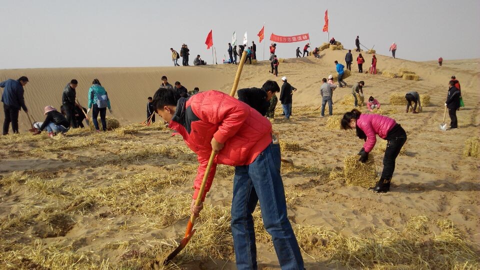 早上9點(diǎn),志愿者們在武威市青年志愿者協(xié)會的帶領(lǐng)下參觀了民勤防沙治沙展覽館,了解了勤勞的民勤人民在防沙治沙的歷程中付出的艱辛和取得的成果。隨后,志愿者們到達(dá)了民勤縣薛百鄉(xiāng)黃篙井的壓沙現(xiàn)場,按照劃分好的區(qū)域,在專業(yè)技術(shù)人員指導(dǎo)下,志愿者們鋪草壓沙,勞動場面分工明確,井然有序。經(jīng)過一天的辛勤勞動,50余畝沙丘變成了棋格般整齊的沙障,堅(jiān)實(shí)的沙障阻止了沙丘的移動,為明春造林活動打好了基礎(chǔ)。