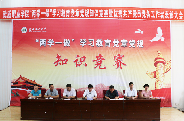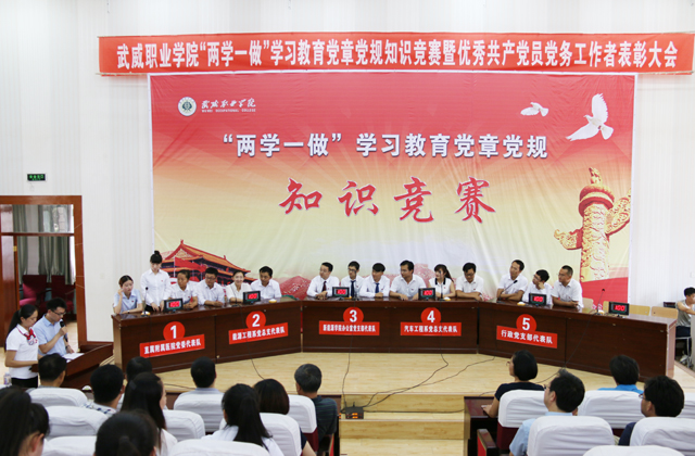 7月6日下午,武威職業(yè)學(xué)院“兩學(xué)一做”學(xué)習(xí)教育黨章黨規(guī)知識競賽暨優(yōu)秀共產(chǎn)黨員、優(yōu)秀黨務(wù)工作者表彰大會在尚德樓正德廳召開。黨委書記張國民,黨委副書記趙明,紀委書記張富國,副院長翟存祥、王永緒、潘玉華、田迎春出席會議。直屬附屬醫(yī)院黨委主要負責(zé)同志、各黨總支(直屬黨支部)書記,各部門負責(zé)人,受表彰的優(yōu)秀共產(chǎn)黨員、優(yōu)秀黨務(wù)工作者以及參加競賽的代表隊成員共270人參加了知識競賽活動和表彰大會。表彰大會由黨委副書記趙明主持。