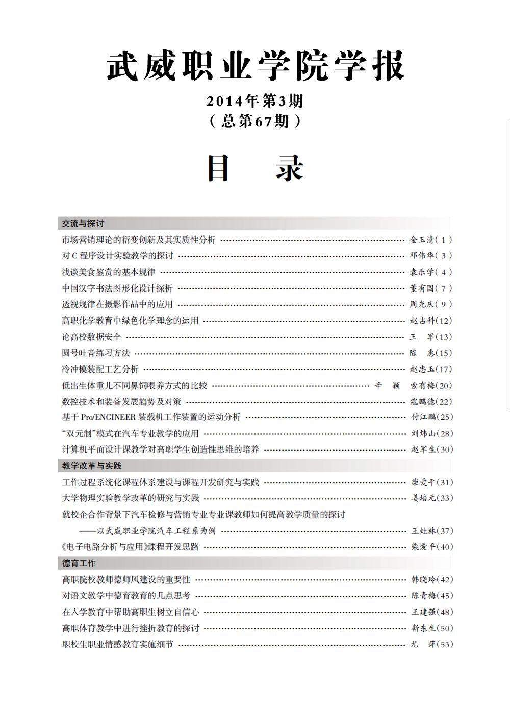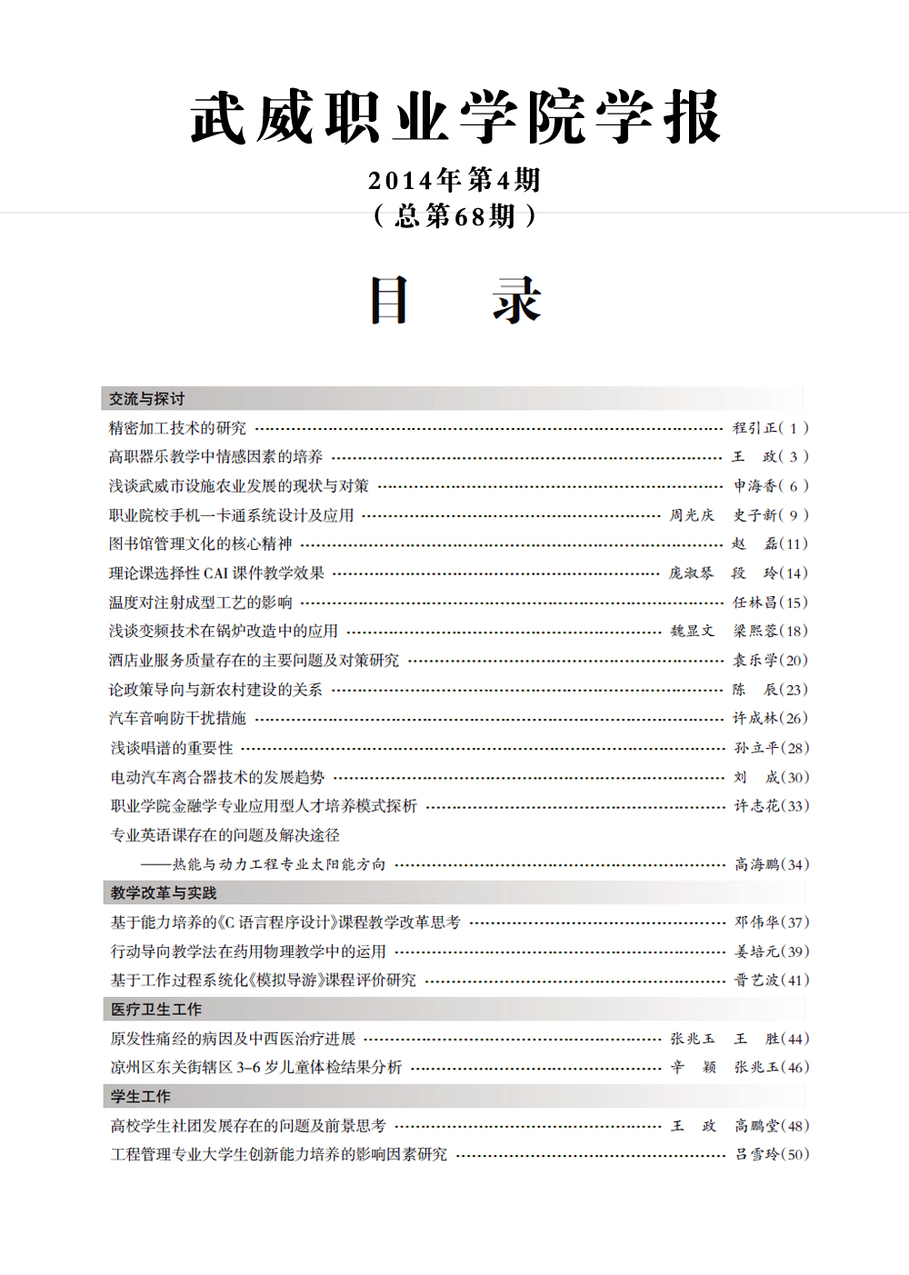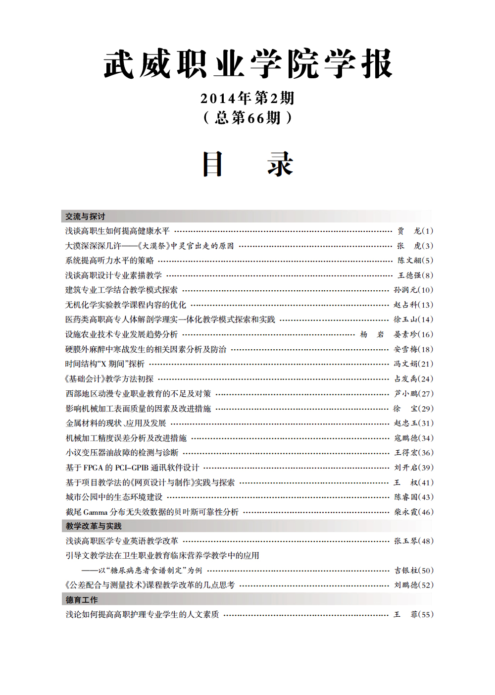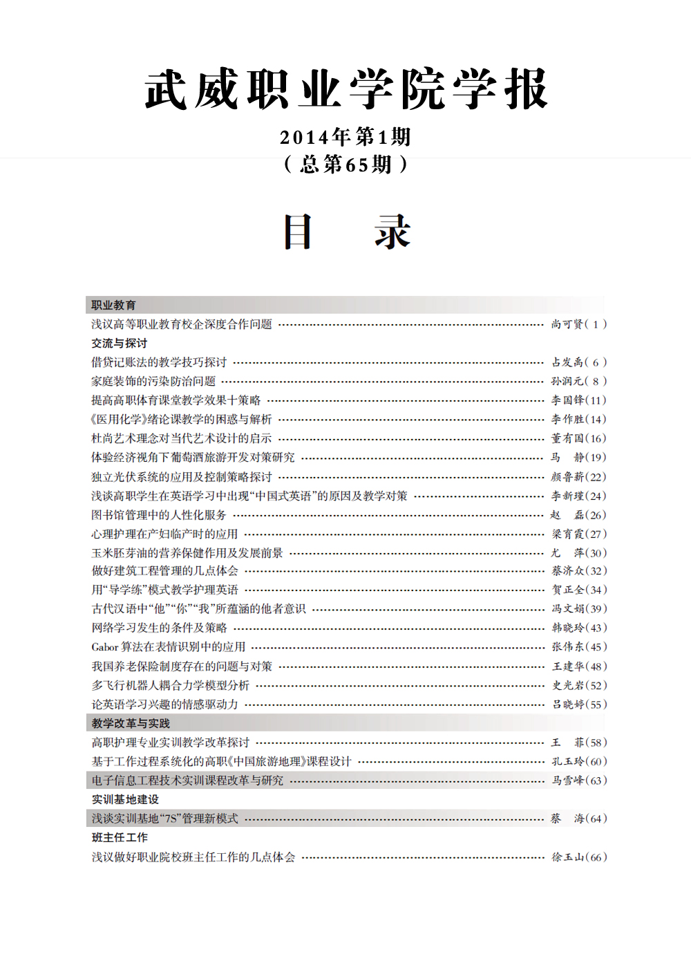 2014年《武威職業(yè)學院學報》目錄