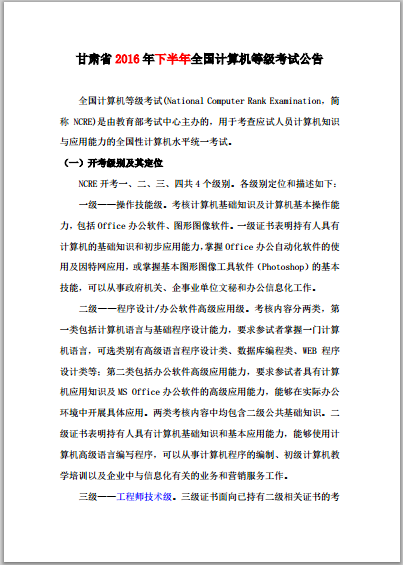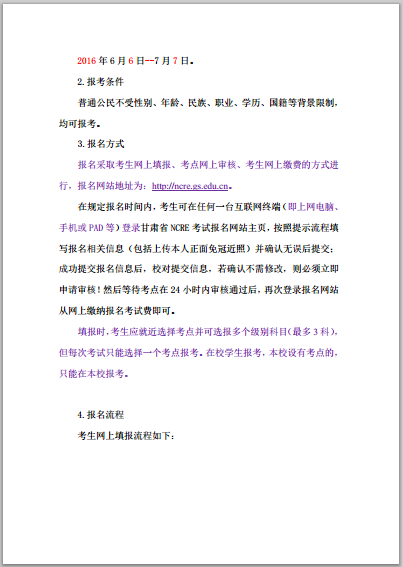 5.詳細(xì)信息請參看甘肅省教育考試院《關(guān)于做好2016年9月全國計算機(jī)等級考試網(wǎng)上報名工作的通知》(甘教考院〔2016〕95號文件)及《甘肅省2016下半年全國計算機(jī)等級考試公告》(已傳至群文件)。