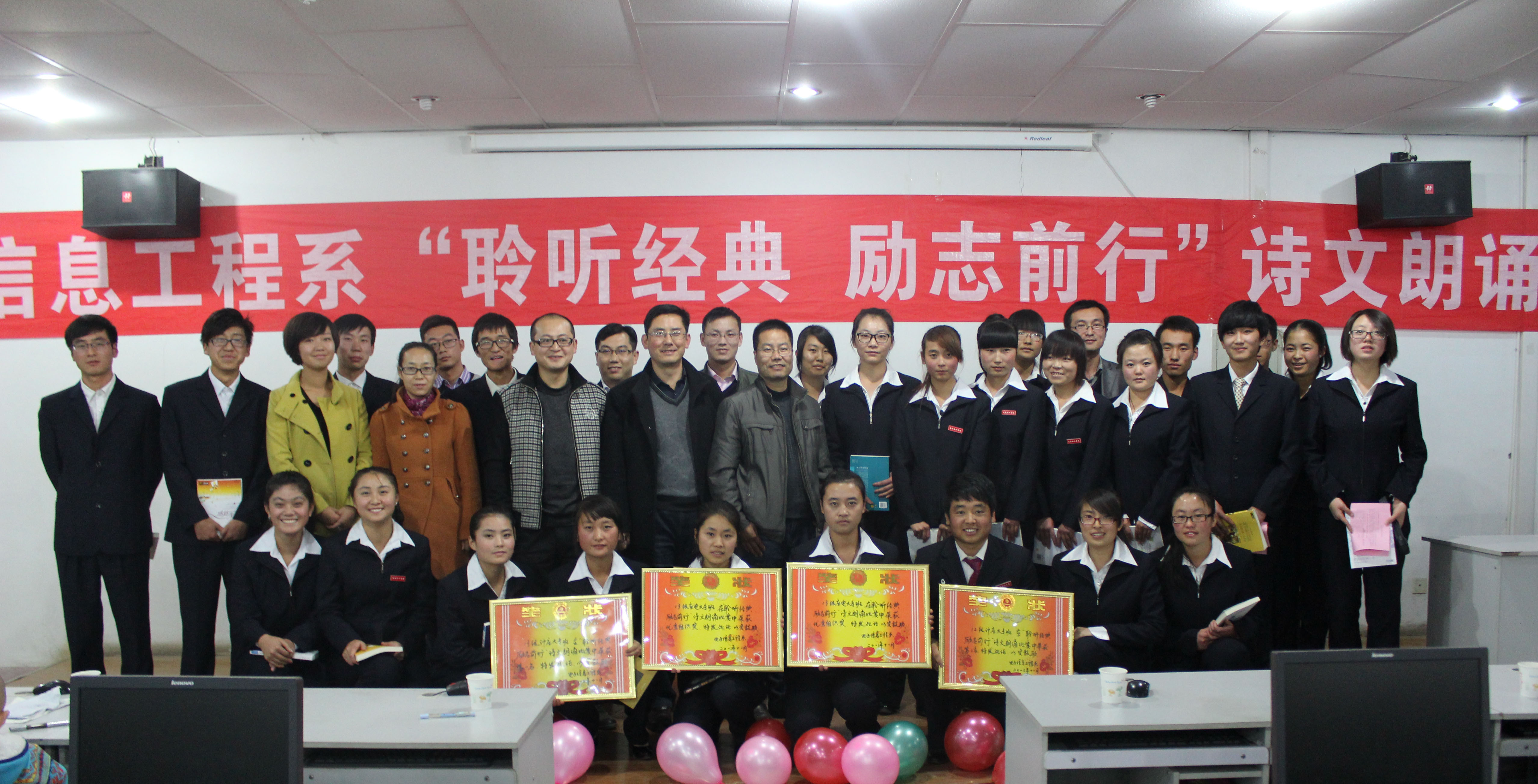 11月14日晚,電子信息工程系團(tuán)總支舉辦“聆聽(tīng)經(jīng)典•勵(lì)志前行”詩(shī)文朗誦比賽,在一號(hào)教學(xué)樓十號(hào)機(jī)房進(jìn)行。黨總支書(shū)記張伯成,輔導(dǎo)員鄧偉華、唐宗舜,全體班主任及180多名學(xué)生觀看了比賽。