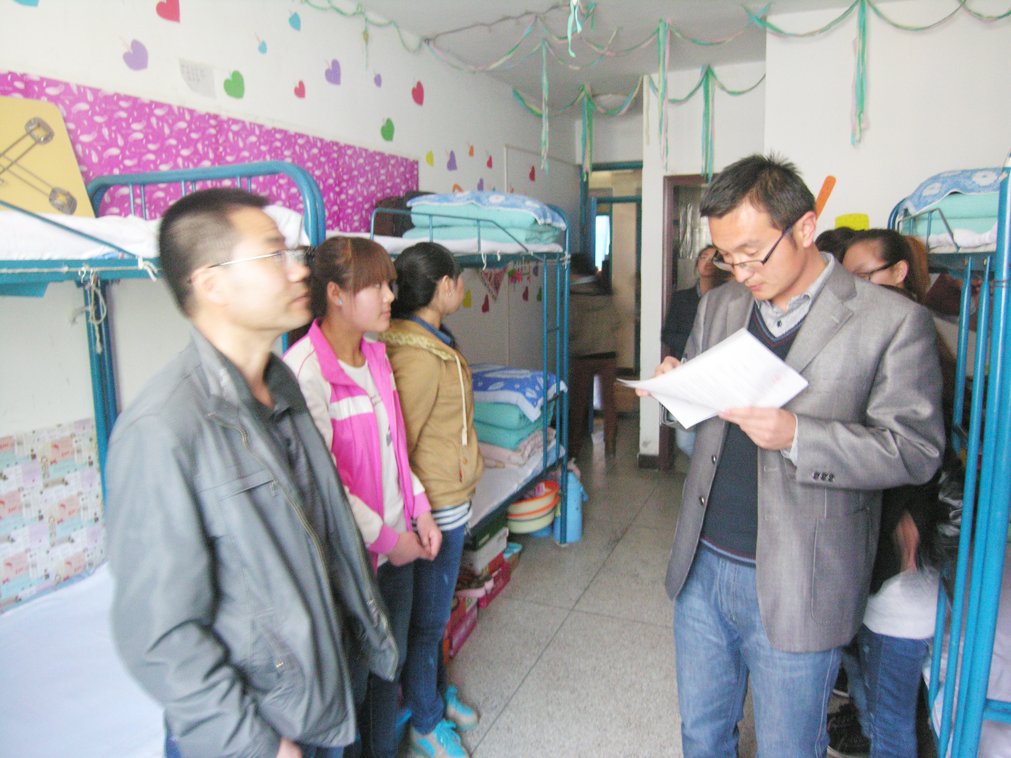 4月11日下午進(jìn)行了集中檢查評比,系黨總支書記張伯成、輔導(dǎo)員、各班主任及學(xué)生會干部擔(dān)任評委。本次活動從講安全、講紀(jì)律、講衛(wèi)生、講文明禮貌等幾個方面進(jìn)行檢查評比,通過評選2-302、4-429、4-228等十間宿舍被評為文明宿舍。