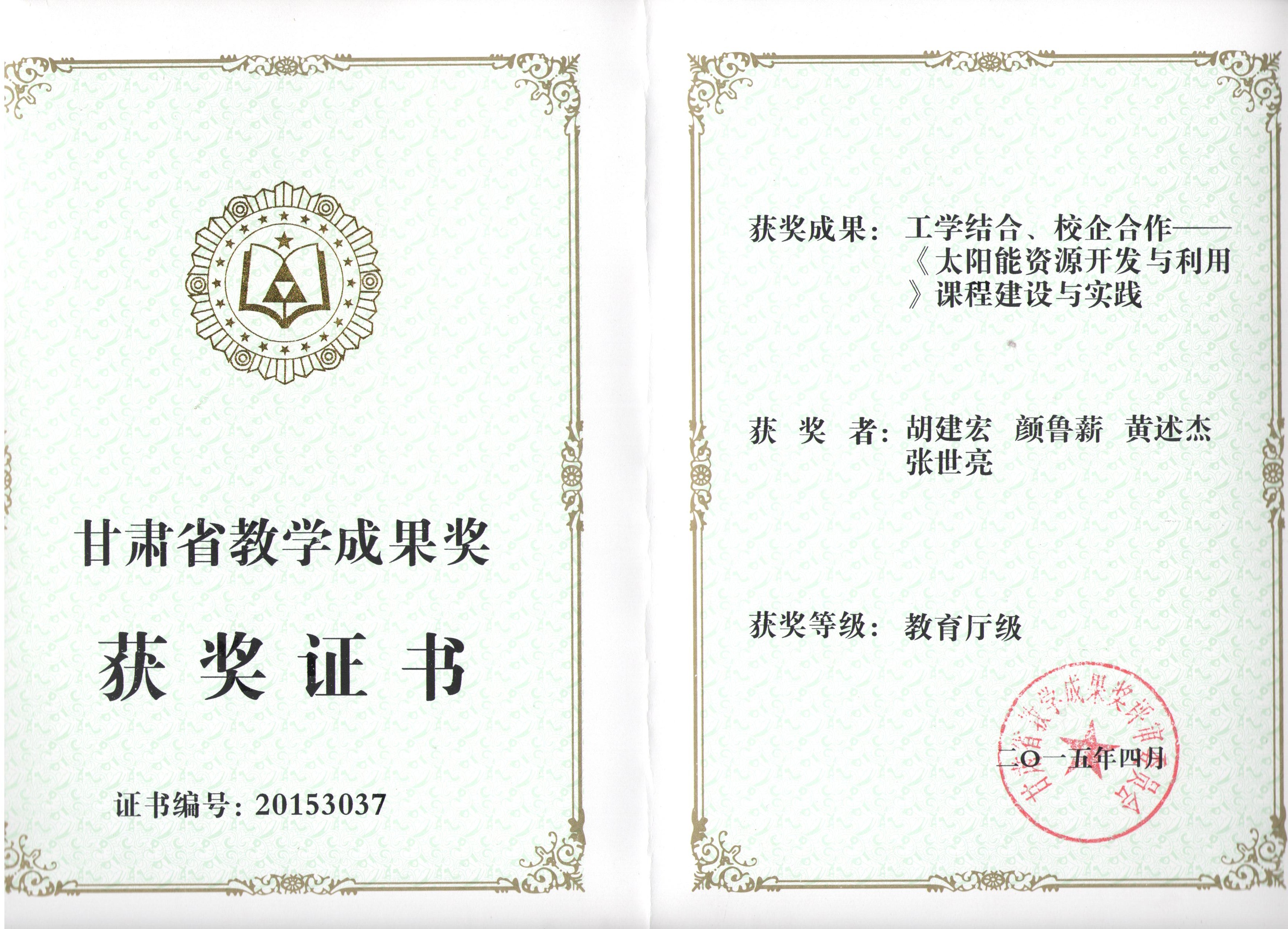 《太陽能資源開發(fā)與利用》課程建設(shè)與實(shí)踐榮獲甘肅省教學(xué)成果獎