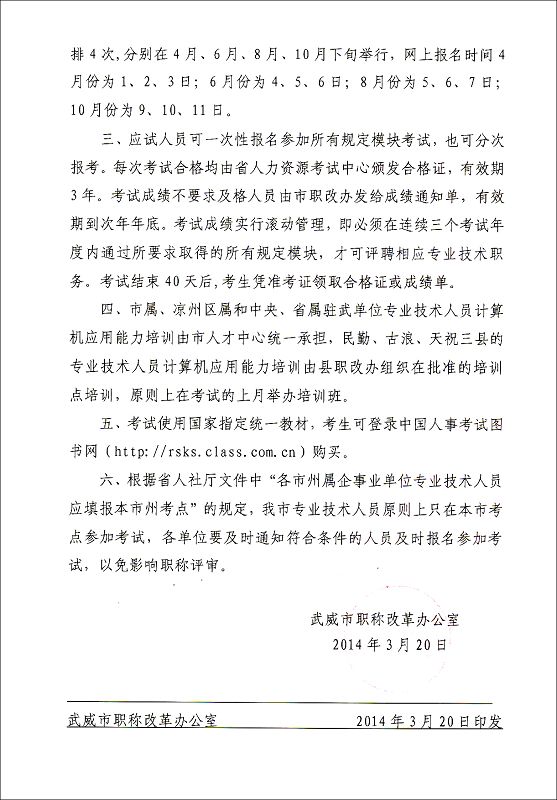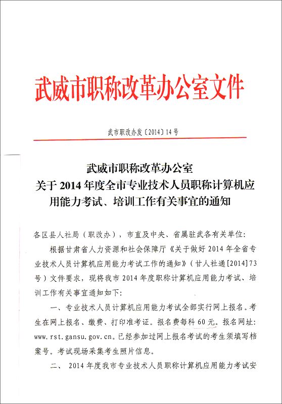 <轉(zhuǎn)>武威市職稱改革辦公室關于2014年度全市專業(yè)技術人員職稱計算機應用能力考試、培訓工作有關事宜的通知