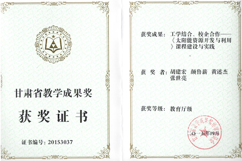 甘肅省教學(xué)成果獎(jiǎng):工學(xué)結(jié)合、校企合作——《太陽(yáng)能資源開(kāi)發(fā)與利用》課程建設(shè)與實(shí)踐