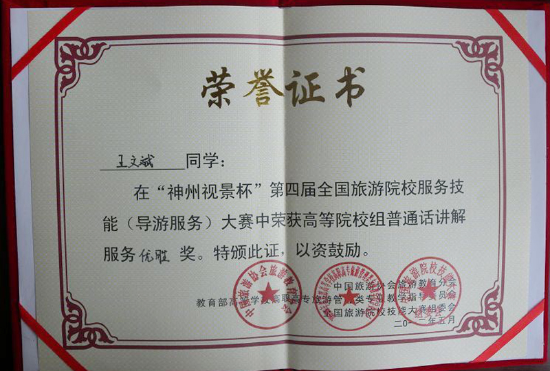 學生王文斌、凌小花、成玉玲榮獲“神州視景杯”第四屆全國旅游院校服務技能(導游技能)大賽優(yōu)秀獎。