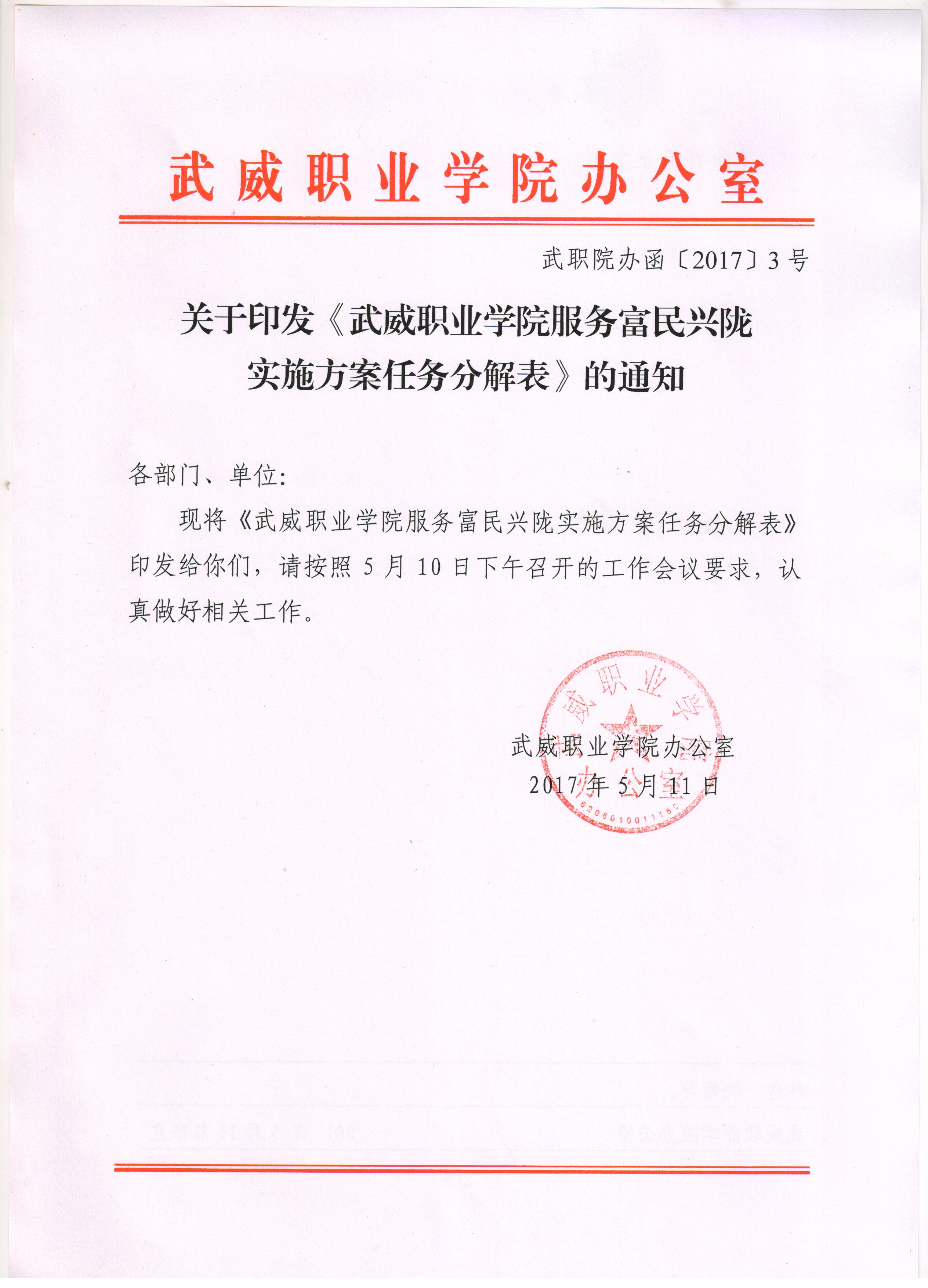 關于印發(fā)《武威職業(yè)學院服務富民興隴實施方案任務分解表》的通知