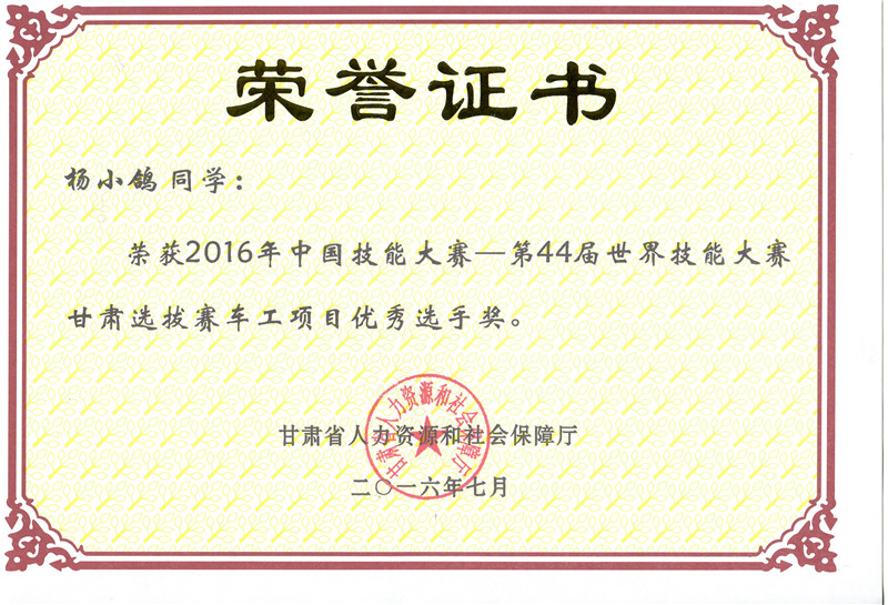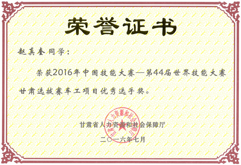 第44屆世界技能大賽甘肅選拔賽車工項(xiàng)目優(yōu)秀獎