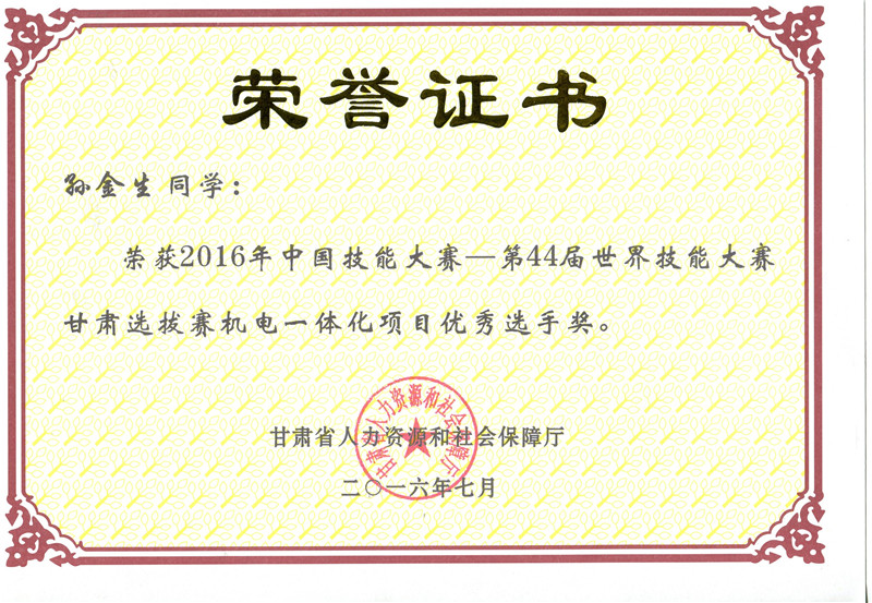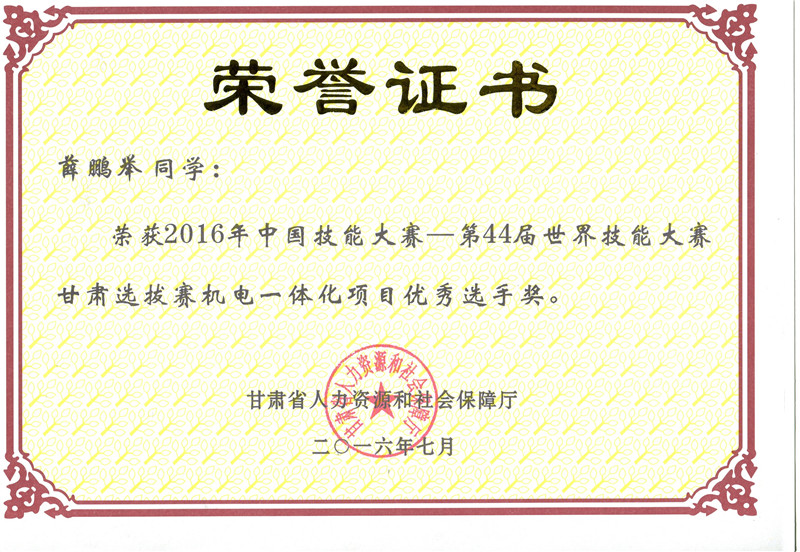 2016年中國技能大賽甘肅選拔賽機(jī)電一體化技術(shù)項目優(yōu)秀獎