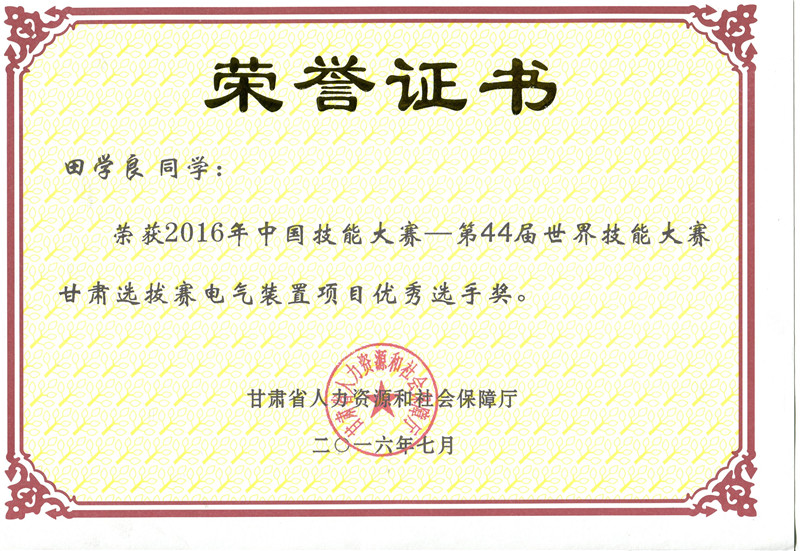 2016年中國(guó)技能大賽甘肅選拔賽電氣裝置項(xiàng)目?jī)?yōu)秀獎(jiǎng)