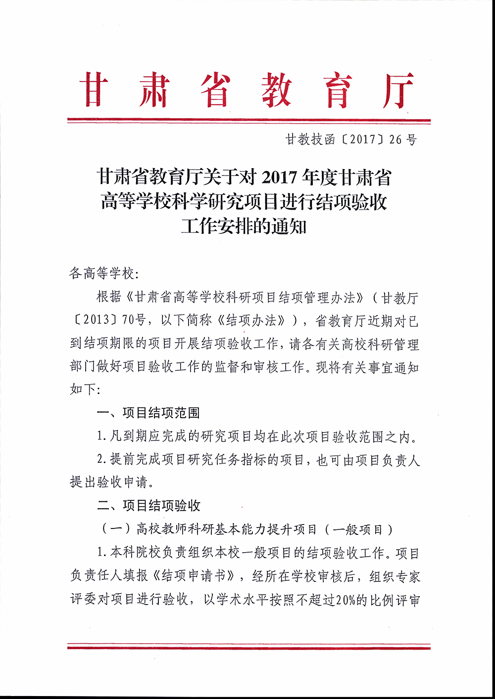 轉(zhuǎn)發(fā)甘肅省教育廳關(guān)于對(duì)2017年度甘肅省高等學(xué)??茖W(xué)研究項(xiàng)目進(jìn)行結(jié)項(xiàng)驗(yàn)收工作安排的通知